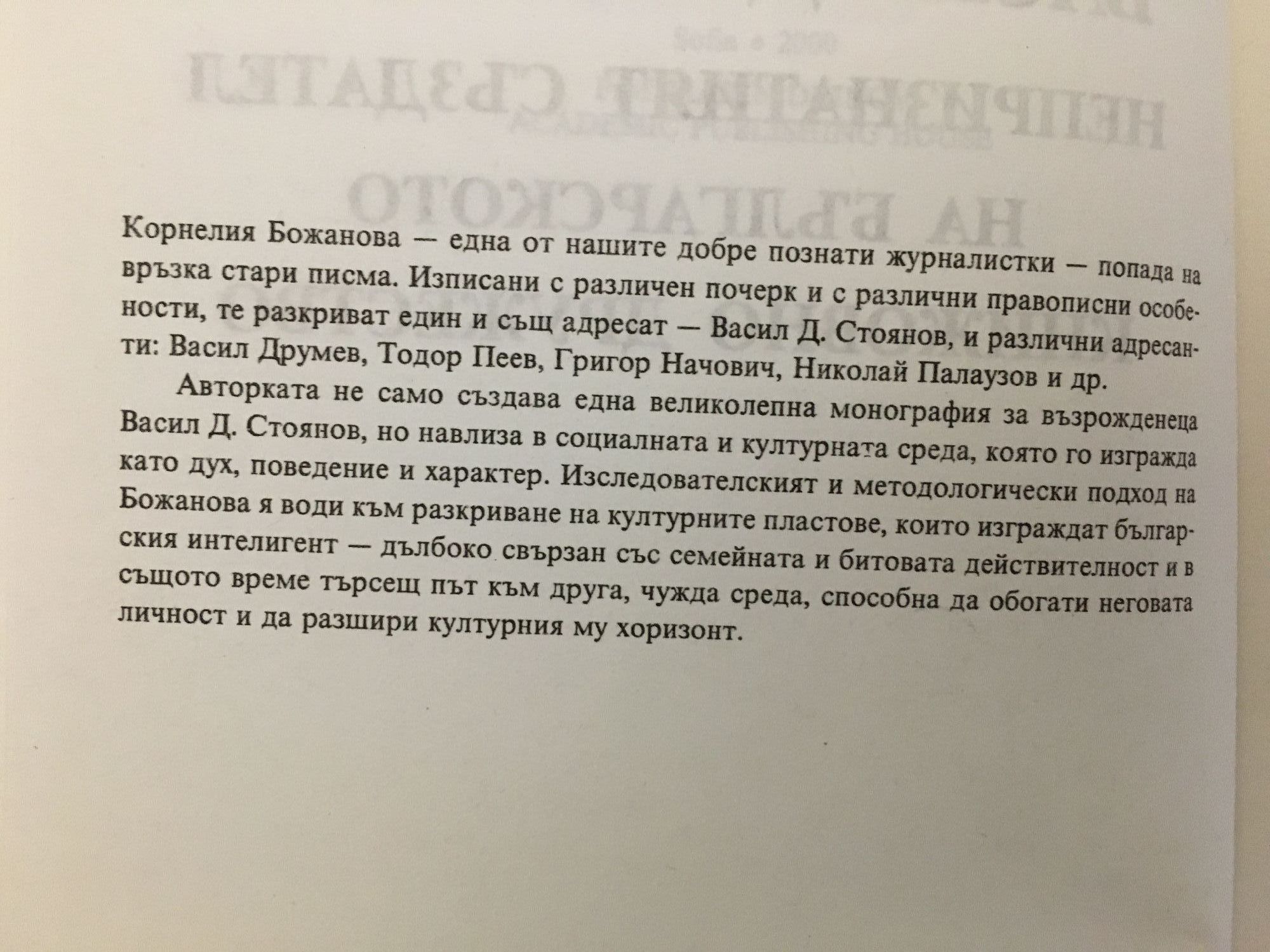 Корнелия Божанова - една от нашите добре познати журналистки - попада на връзка стари писма. Изписани с различен почерк и с различни правописни особености, те разкриват един и същ адресат - Васил Д Стоянов, и различни адресанти: Васил Друмев, Тодор Пеев, Григор Начович, Николай Палаузов и др. Авторката не само създава една великолепна монография за възрожденеца Васил Д. Стоянов, но навлиза в социалната и културната среда, която го изгражда като дух, поведение и характер. Изследователският и методологически подход на Божанова я води към разкриване на културните пластове, които изграждат българския интелигент - дълбоко свързан със семейната и битовата действителност и в същото време търсещ път към друга, чужда среда, способна да обогати неговата личност и да разшири културния му хоризонт.