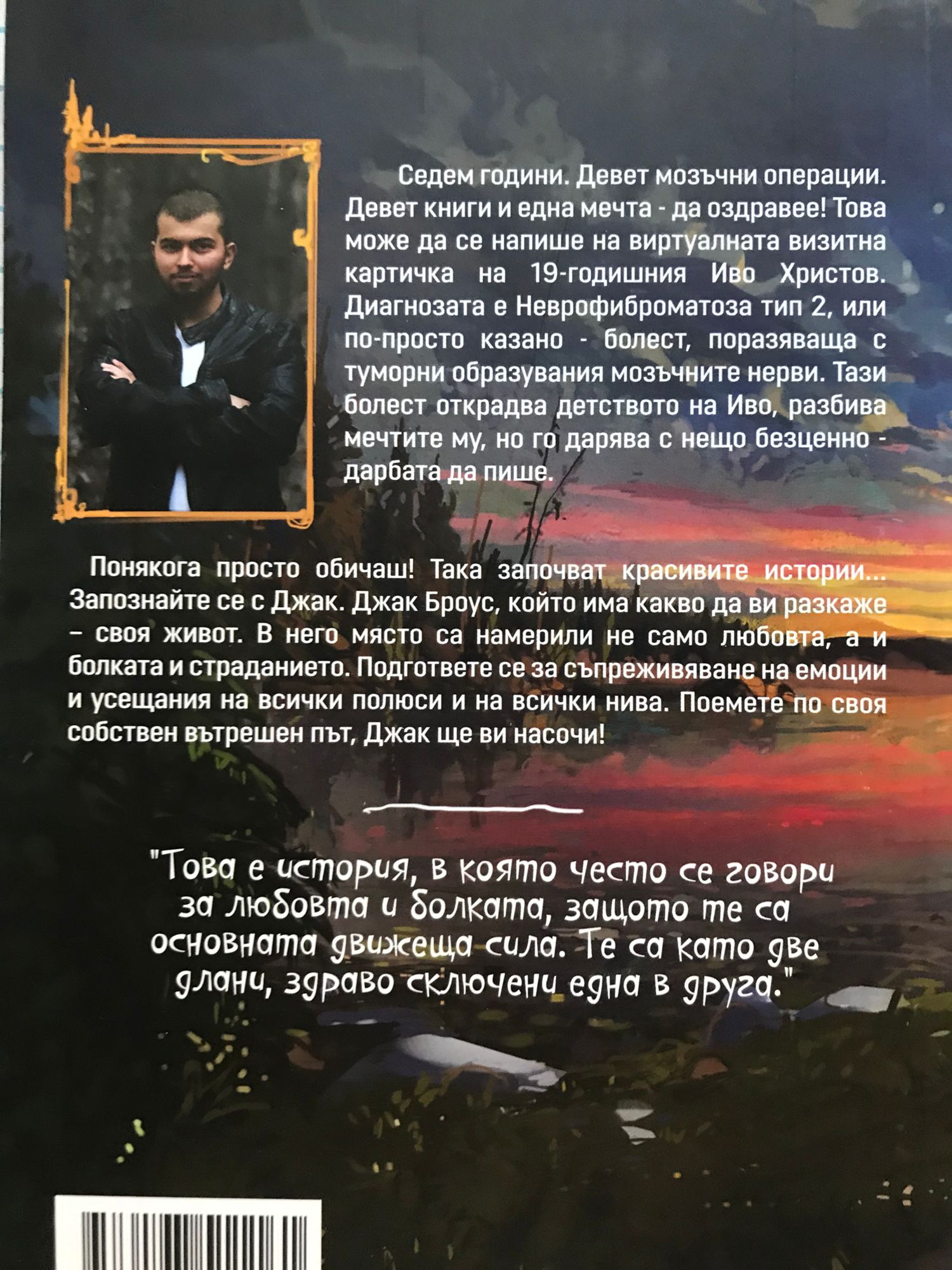 Понякога просто обичаш! Така започват красивите истории... Запознайте се с Джак. Джак Броус, който има какво да ви разкаже - своя живот. В него място са намерили не само любовта, а и болката и страданието. Подгответе се за съпреживяване на емоции и усещания на всички полюси и на всички нива. Поемете по своя собствен вътрешен път, Джак ще ви насочи! Това е история, в която често се говори за любовта и болката, защото те са основната движеща сила. Те са като две длани, здраво сключени една в друга. Седем години. Девет мозъчни операции. Девет книги и една мечта – да оздравее! Това може да се напише на виртуалната визитна картичка на 19-годишния Иво Христов. Диагнозата е Неврофиброматоза тип 2, или по-просто казано – болест, поразяваща с туморни образувания мозъчните нерви. Тази болест открадва детството на Иво, разбива мечтите му, но го дарява с нещо безценно – дарбата да пише.