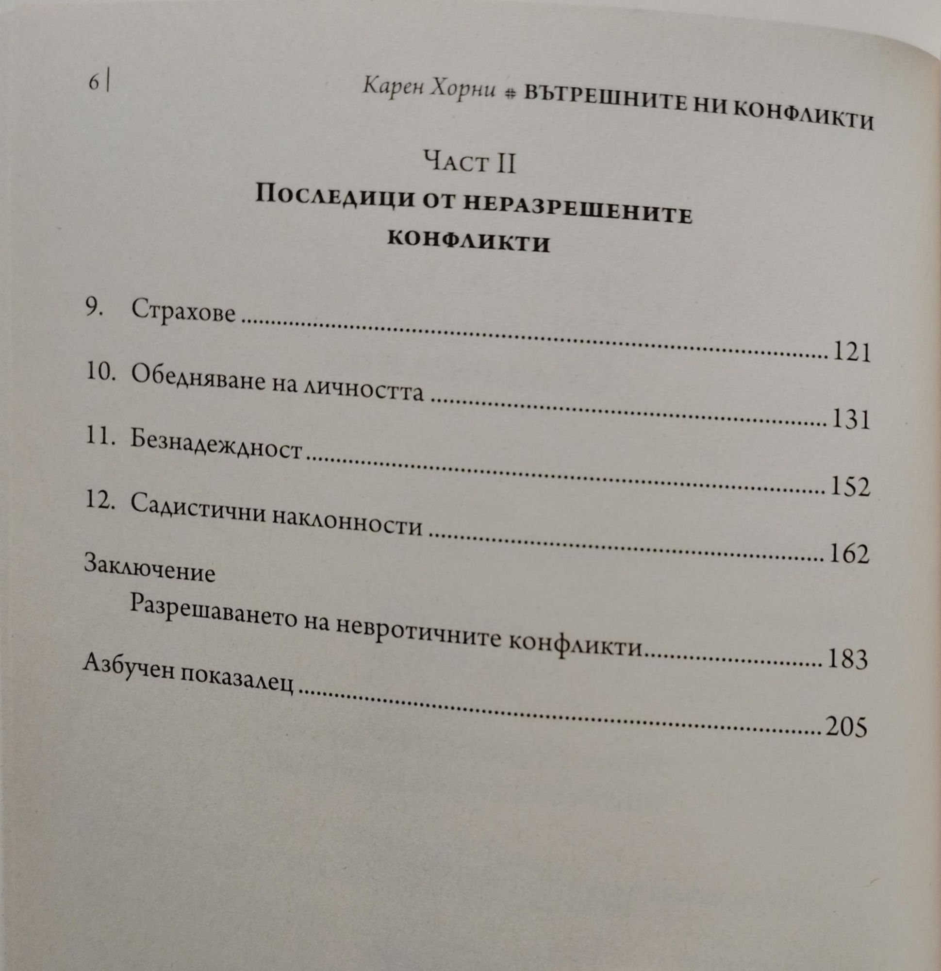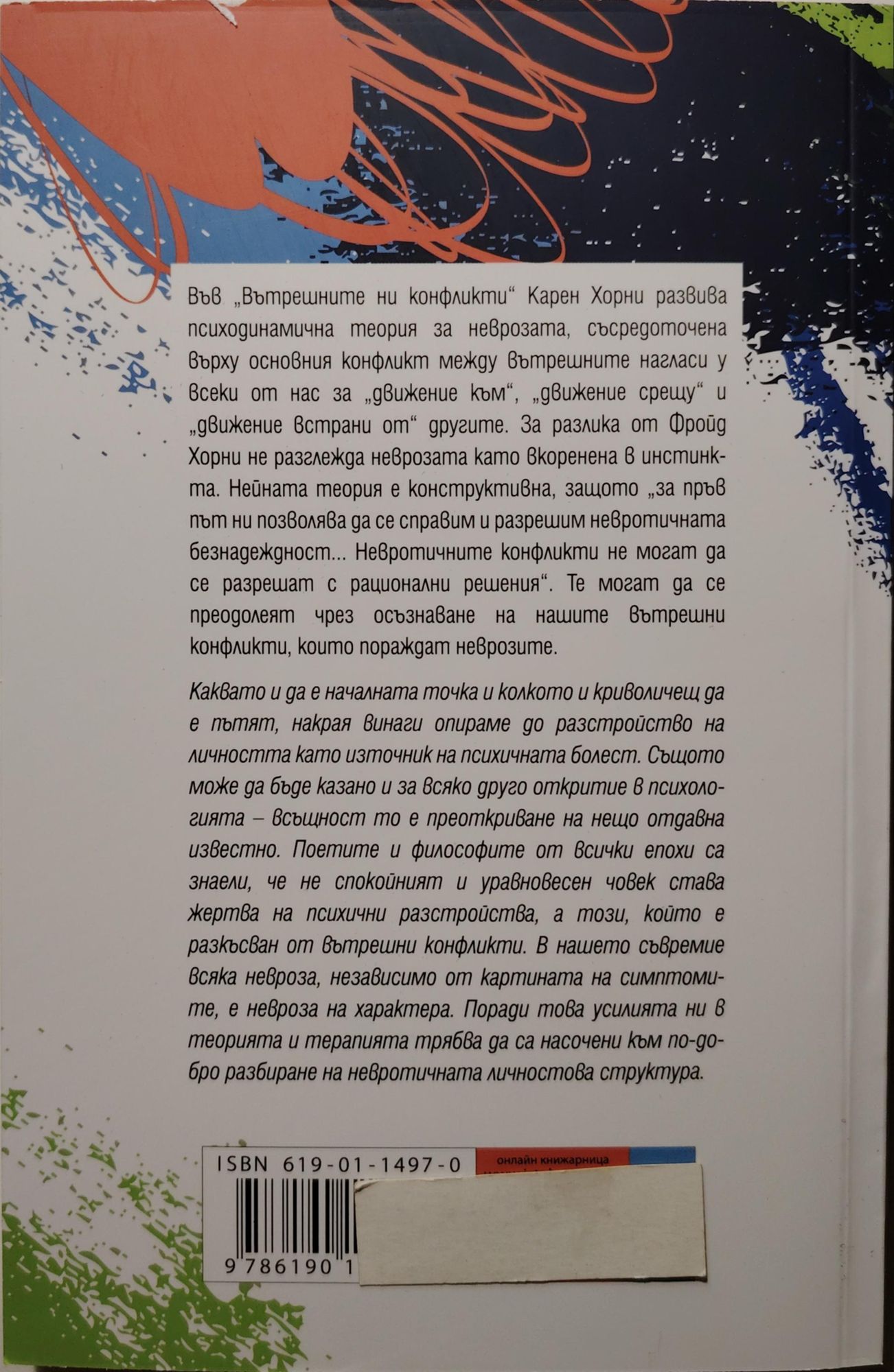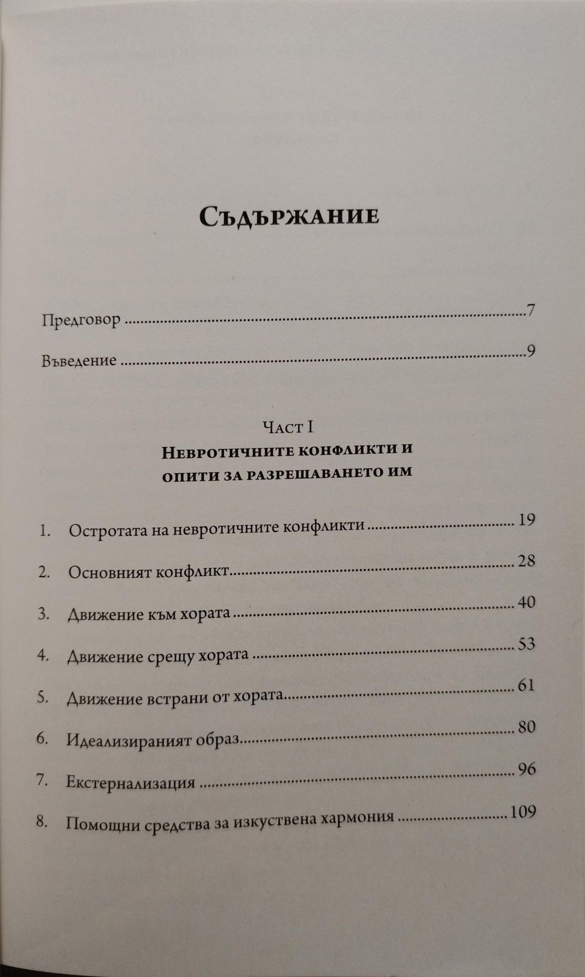 Книгата „Вътрешните ни конфликти“ на Карен Хорни развива динамична теория за неврозата, съсредоточена върху основния конфликт между нагласите за „движение към“, „движение срещу“ и „движение встрани от“ хората. За разлика от Фройд, Хорни не разглежда неврозата като вкоренена в инстинкта. По нейните думи нейната теория е конструктивна, защото „за пръв път ни позволява да се справим и разрешим невротичната безнадеждност... Невротичните конфликти не могат да се разрешат с рационални решения... Но [те] могат да се разрешат чрез промяна в условията вътре в личността, които са ги породили“.