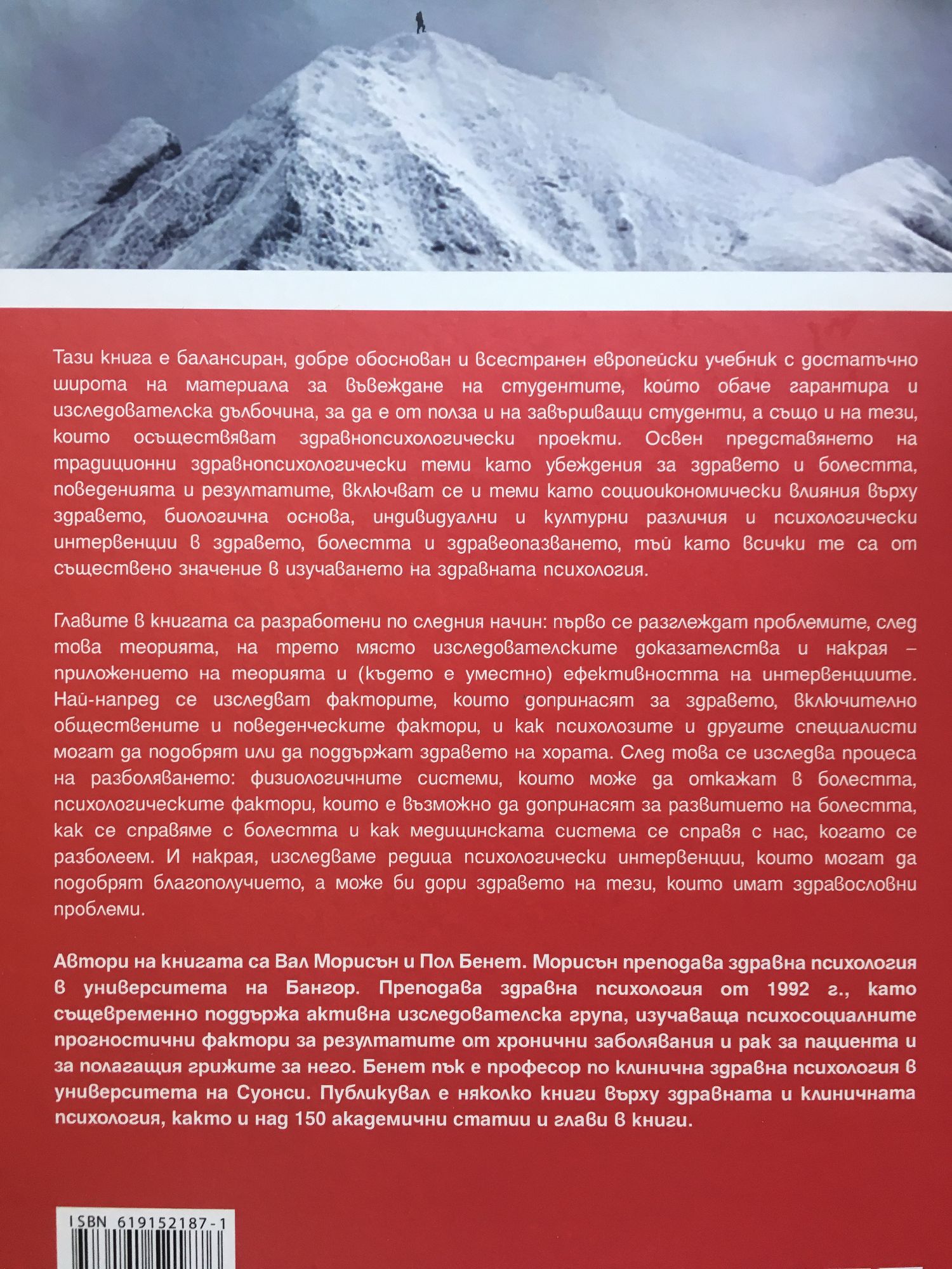 Тази книга е балансиран, добре обоснован и всестранен европейски учебник с достатъчно широта на материала за въвеждане на студентите, който обаче гарантира и изследователска дълбочина, за да е от полза и на завършващи студенти, а също и на тези, които осъществяват здравнопсихологически проекти. Освен представянето на традиционни здравнопсихологически теми като убеждения за здравето и болестта, поведенията и резултатите, включват се и теми като социоикономически влияния върху здравето, биологична основа, индивидуални и културни различия и психологически интервенции в здравето, болестта и здравеопазването, тъй като всички те са от съществено значение в изучаването на здравната психология. Главите в книгата са разработени по следния начин: първо се разглеждат проблемите, след това теорията, на трето място изследователските доказателства и накрая ‐ приложението на теорията и (където е уместно) ефективността на интервенциите. Най-напред се изследват факторите, които допринасят за здравето, включително обществените и поведенческите фактори, и как психолозите и другите специалисти могат да подобрят или да поддържат здравето на хората. След това се изследва процеса на разболяването: физиологичните системи, които може да откажат в болестта, психологическите фактори, които е възможно да допринасят за развитието на болестта, как се справяме с болестта и как медицинската система се справя с нас, когато се разболеем. И накрая, изследваме редица психологически интервенции, които могат да подобрят благополучието, а може би дори здравето на тези, които имат здравословни проблеми.