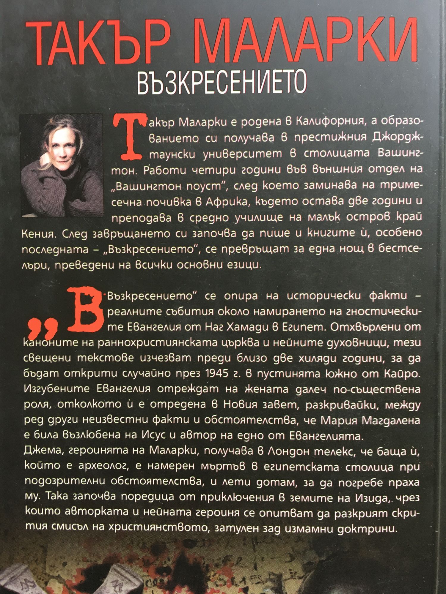 „Възкресението“ се опира на исторически факти – реалните събития около намирането на гностическите Евангелия от Наг Хамади в Египет. Отхвърлени от каноните на раннохристиянската църква и нейните духовници, тези свещени текстове изчезват преди близо две хиляди години, за да бъдат открити случайно през 1945 г. в пустинята южно от Кайро. Изгубените Евангелия отреждат на жената далеч по-съществена роля, отколкото й е отредена в Новия завет, разкривайки, между ред други неизвестни факти и обстоятелства, че Мария Магдалена е била възлюбена на Исус и автор на едно от Евангелията. Джема, героинята на Маларки, получава в Лондон телекс, че баща й, който е археолог, е намерен мъртъв в египетската столица при подозрителни обстоятелства, и лети дотам, за да погребе праха му. Така започва поредица от приключения в земите на Изида, чрез които авторката и нейната героиня се опитват да разкрият скрития смисъл на християнството, затулен зад измамни доктрини. Такър Маларки е родена в Калифорния, а образованието си получава в престижния Джорджтаунски университет в столицата Вашингтон. Работи четири години във външния отдел на „Вашингтон поуст“, след което заминава на тримесечна почивка в Африка, където остава две години и преподава в средно училище на малък остров край Кения. След завръщането си започва да пише и книгите й, особено последната – „Възкресението“, се превръщат за една нощ в бестселъри, преведени на всички основни езици