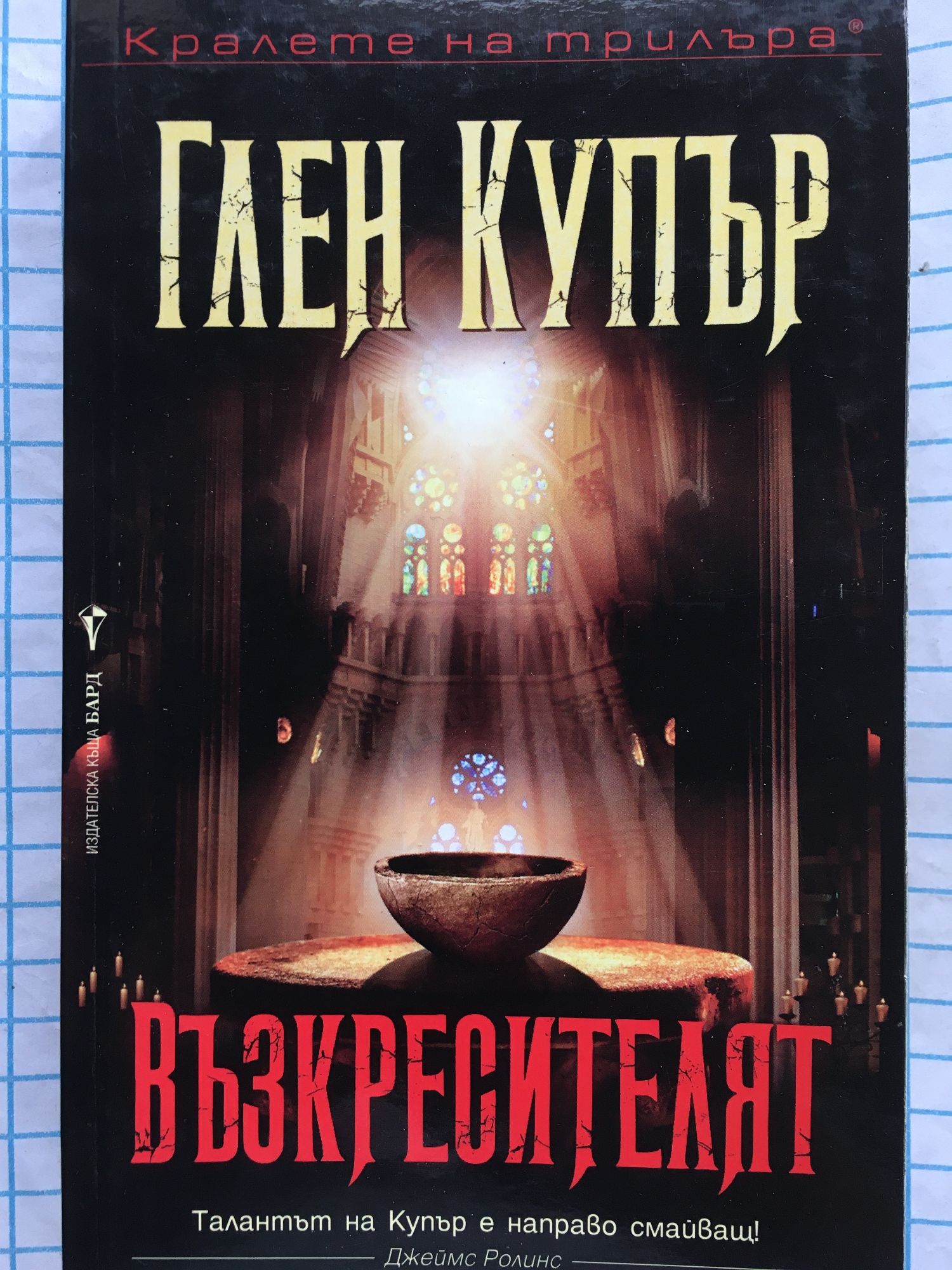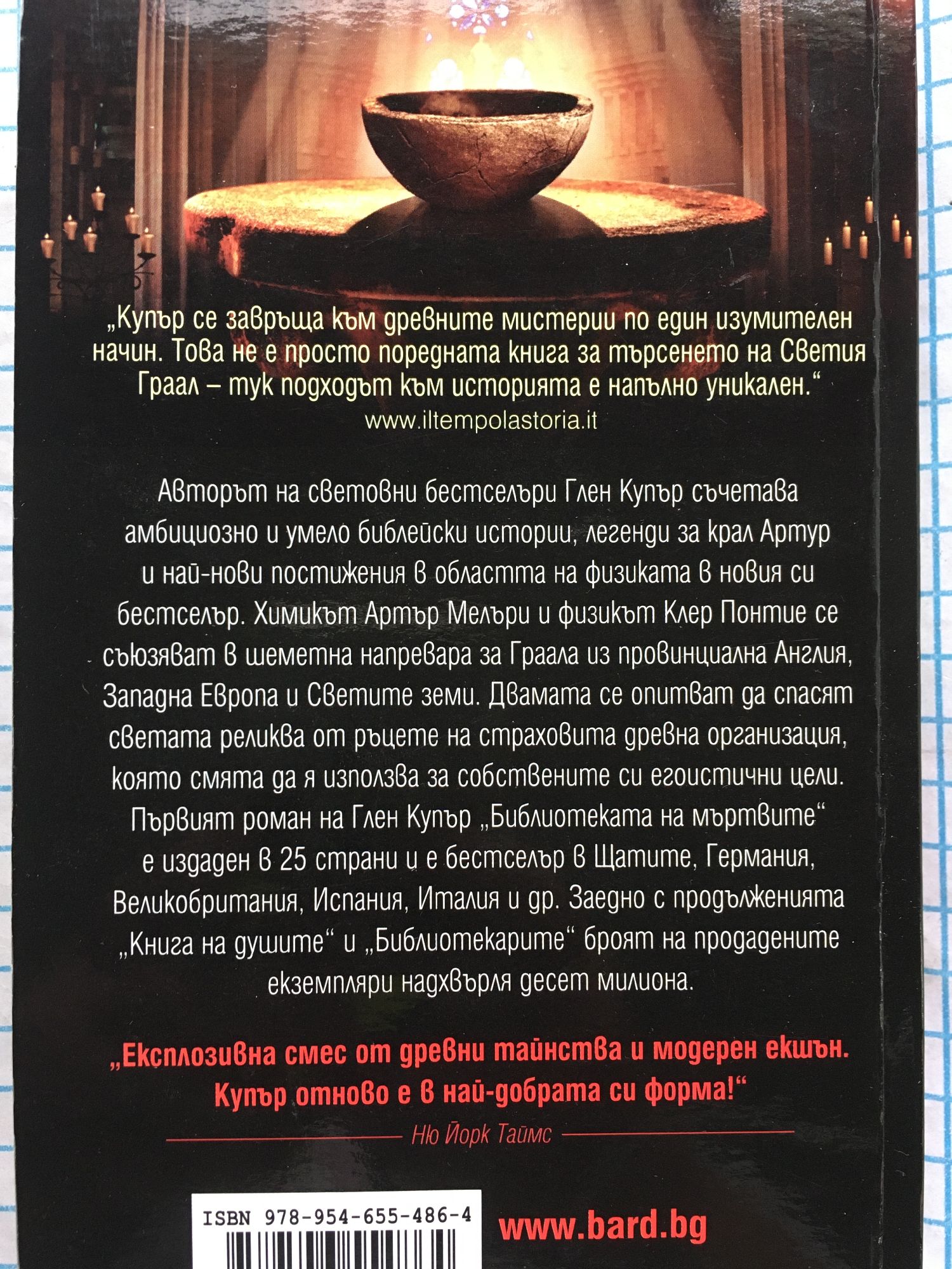 „Талантът на Купър е направо смайващ!“ Джеймс Ролинс „Купър се завръща към древните мистерии по един изумителен начин. Това не е просто поредната книга за търсенето на Светия Граал – тук подходът към историята е напълно уникален“ Авторът на световни бестселъри Глен Купър съчетава амбициозно и умело библейски истории, легенди за крал Артур и най-нови постижения в областта на физиката в новия си бестселър. Химикът Артър Мелъри и физикът Клер Понтие се съюзяват в шеметна напревара за Граала из провинциална Англия, Западна Европа и Светите земи. Двамата се опитват да спасят светата реликва от ръцете на страховита древна организация, която смята да използва научно обяснените й възможности за собствените си егоистични цели. Първият роман на Глен Купър „Библиотеката на мъртвите” е издаден в 25 страни, и е бестселър в Щатите, Германия, Великобритания, Испания, Италия и др. Заедно с продължението „Книга на душите” и „Библиотекарите“ броят на продадените екземпляри надхвърля десет милиона. „Експлозивна смес от древни тайнства и модерен екшън. Купър отново е в най-добрата си форма!“ Ню Йорк Таймс