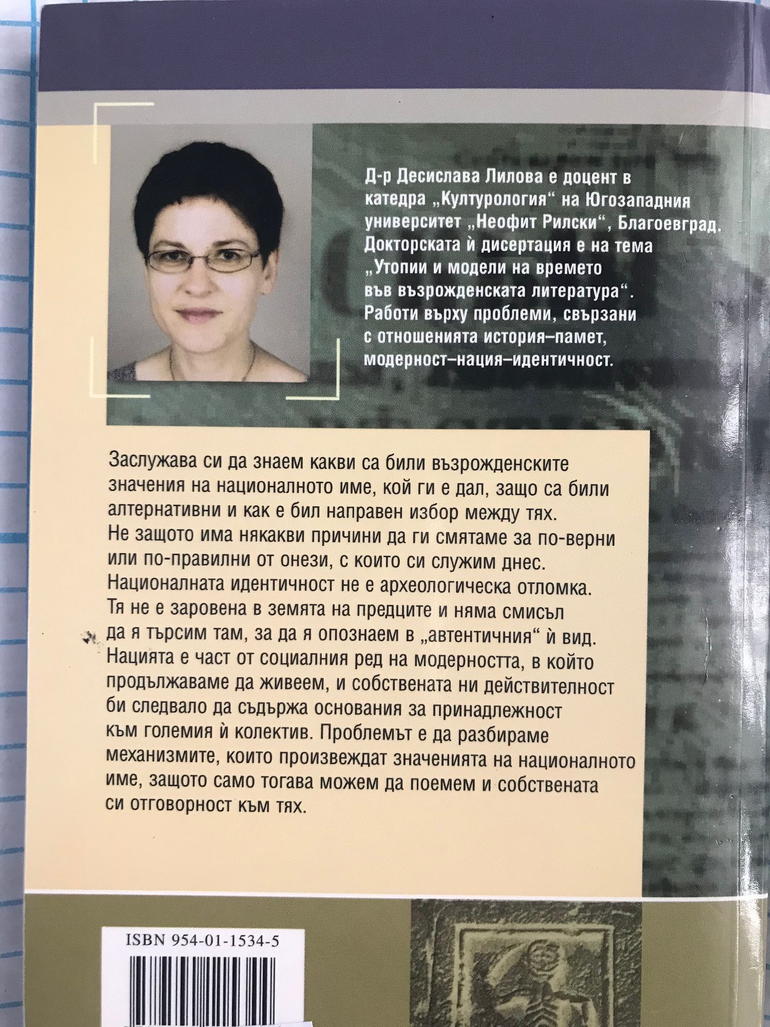 Десислава Лилова е доцент в катедра „Културология" на Югозападния университет „Неофит Рилски", Благоевград. Докторската й дисертация е на тема „Утопии и модели на времето във възрожденската литература". Работи върху проблеми, свързани с отношенията история-памет, модерност-нация-идентичност. „Възрожденските значения на националното име" обобщава резултатите от тези изследвания и анализира начина, по който се формират алтернативни отговори на въпроса „какво означава да се наричаме българи". Книгата се опитва да разбере смисъла на отговорите, които са били дадени преди около сто и петдесет години - в епохата, когато се е формирала българската нация. Те се оказват продуктивни, тъй като успяват да завладеят въображението на хиляди и хиляди хора, които никога не са се виждали и никога не са се запознавали реално. И въпреки това тяхното чувство за принадлежност към огромната „въобразена общност" става първа и основна част от отговора на въпроса „кой съм аз". Нацията е част от социалния ред на модерността, в който продължаваме да живеем и собствената ни действителност би следвало да съдържа основания за принадлежност към големия й колектив. Проблемът е да разбираме механизмите, които произвеждат значенията на националното име, защото само тогава можем да поемем и собствената си отговорност към тях.