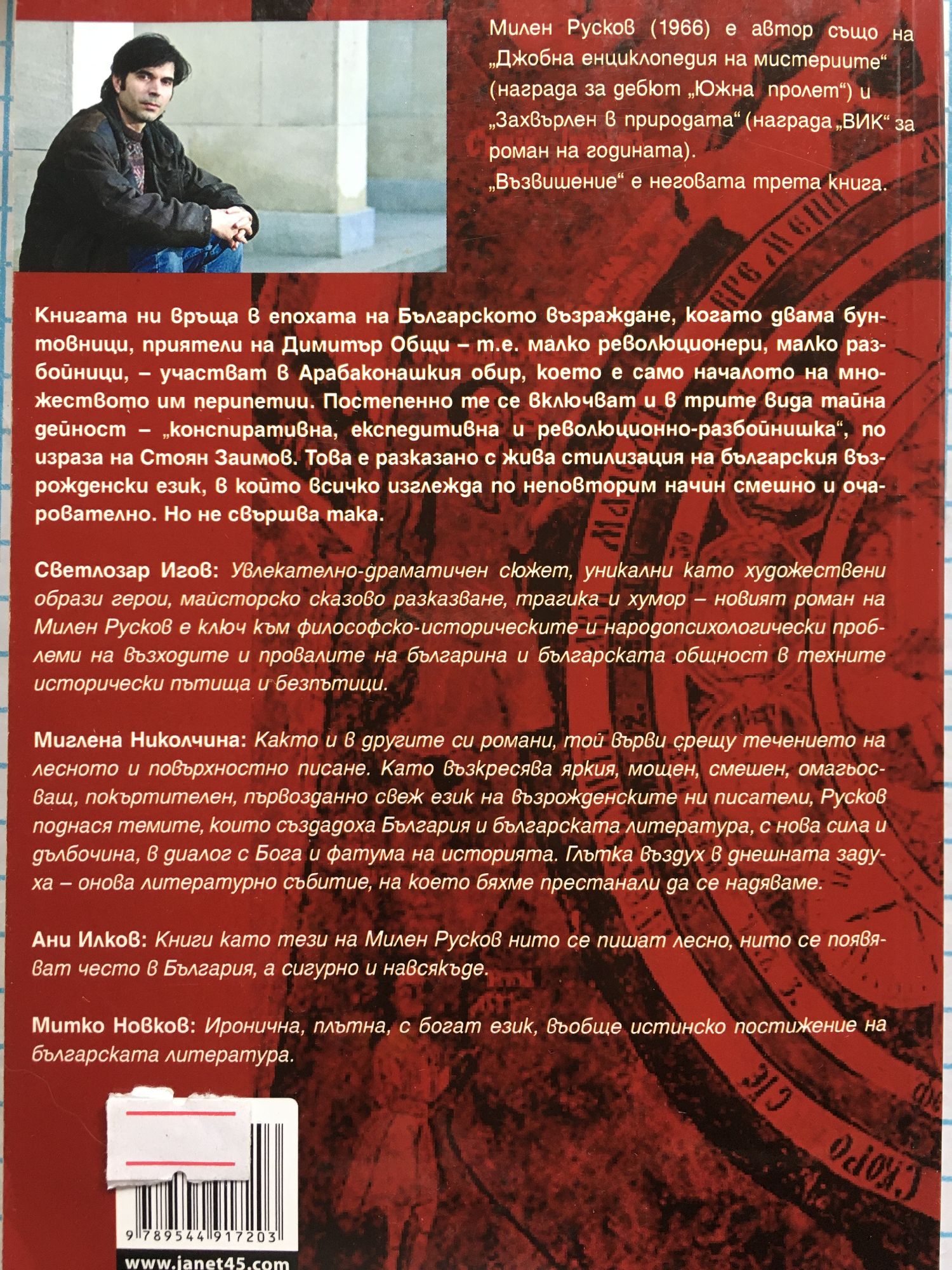 Милен Русков (1966) е автор и на "Джобна енциклопедия на мистериите"(награда за дебют „Южна пролет”) и „Захвърлен в природата“ (награда „ВИК“ за роман на годината). Тази книга ни връща в епохата на българското Възраждане, когато двама бунтовници, приятели на Димитър Общи – т.е. малко революционери, малко разбойници, – участват в Арабаконашкия обир, което е само началото на множеството им перипетии. Постепенно те се включват и в трите вида тайна дейност – „конспиративна, експедитивна и революционно-разбойнишка“, по израза на Стоян Заимов. Това е разказано с жива стилизация на българския възрожденски език, в който всичко изглежда по неповторим начин смешно и очарователно. Но не свършва така. Светлозар Игов: Увлекателно-драматичен сюжет, уникални като художествени образи герои, майсторско сказово разказване, трагика и хумор – новият роман на Милен Русков е ключ към философско-историческите и народопсихологически проблеми на възходите и провалите на българина и българската общност в техните исторически пътища и безпътици. Миглена Николчина: Както и в другите си романи, той върви срещу течението на лесното и повърхностно писане. Като възкресява яркия, мощен, смешен, омагьосващ, покъртителен, първозданно свеж език на възрожденските ни писатели, Русков поднася темите, които създадоха България и българската литература, с нова сила и дълбочина, в диалог с Бога и фатума на историята. Глътка въздух в днешната задуха – онова литературно събитие, на което бяхме престанали да се надяваме. Ани Илков: Книги като тези на Милен Русков нито се пишат лесно, нито се появяват често в България, а сигурно и навсякъде. Митко Новков: Иронична, плътна, с богат език, въобще истинско постижение на българската литература.