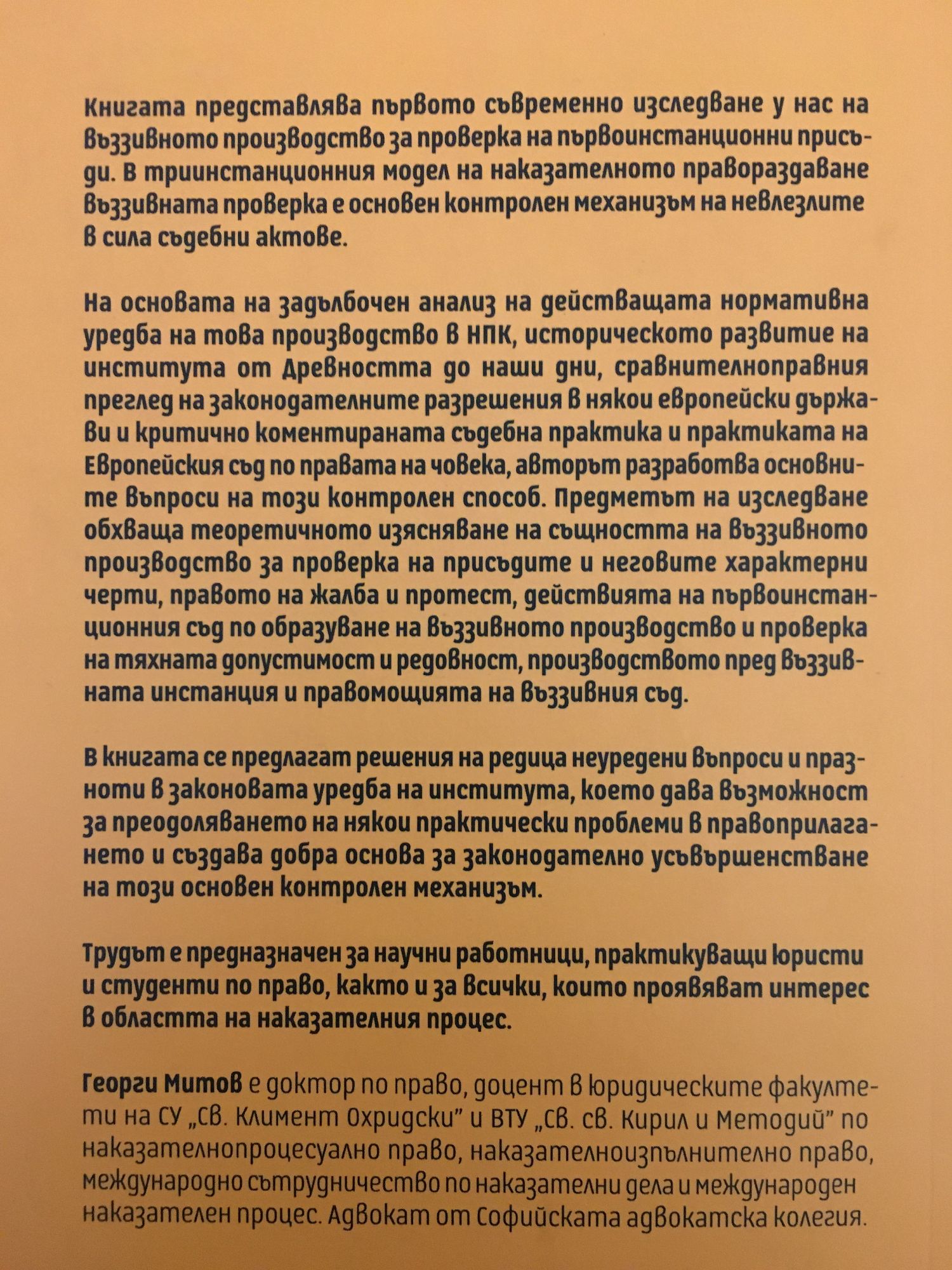 Книгата представлява първото съвременно изследване у нас на въззивното производство за проверка на първоинстанционни присъди. В триинстанционния модел на наказателното правораздаване въззивната проверка е основен контролен механизъм на невлезлите в сила съдебни актове. На основата на задълбочен анализ на действащата нормативна уредба на това производство в НПК, историческото развитие на института от Древността до наши дни, сравнителноправния преглед на законодателните разрешения в някои европейски държави и критично коментираната съдебна практика и практиката на Европейския съд по правата на човека, авторът разработва основните въпроси на този контролен способ. Предметът на изследване обхваща теоретичното изясняване на същността на въззивното производство за проверка на присъдите и неговите характерни черти, правото на жалба и протест, действията на първоинстанционния съд по образуване на въззивното производство и проверка на тяхната допустимост и редовност, производството пред въззивната инстанция и правомощията на въззивния съд. В книгата се предлагат решения на редица неуредени въпроси и празноти в законовата уредба на института, което дава възможност за преодоляването на някои практически проблеми в правоприлагането и създава добра основа за законодателно усъвършенстване на този основен контролен механизъм. Трудът е предназначен за научни работници, практикуващи юристи и студенти по право, както и за всички, които проявяват интерес в областта на наказателния процес.