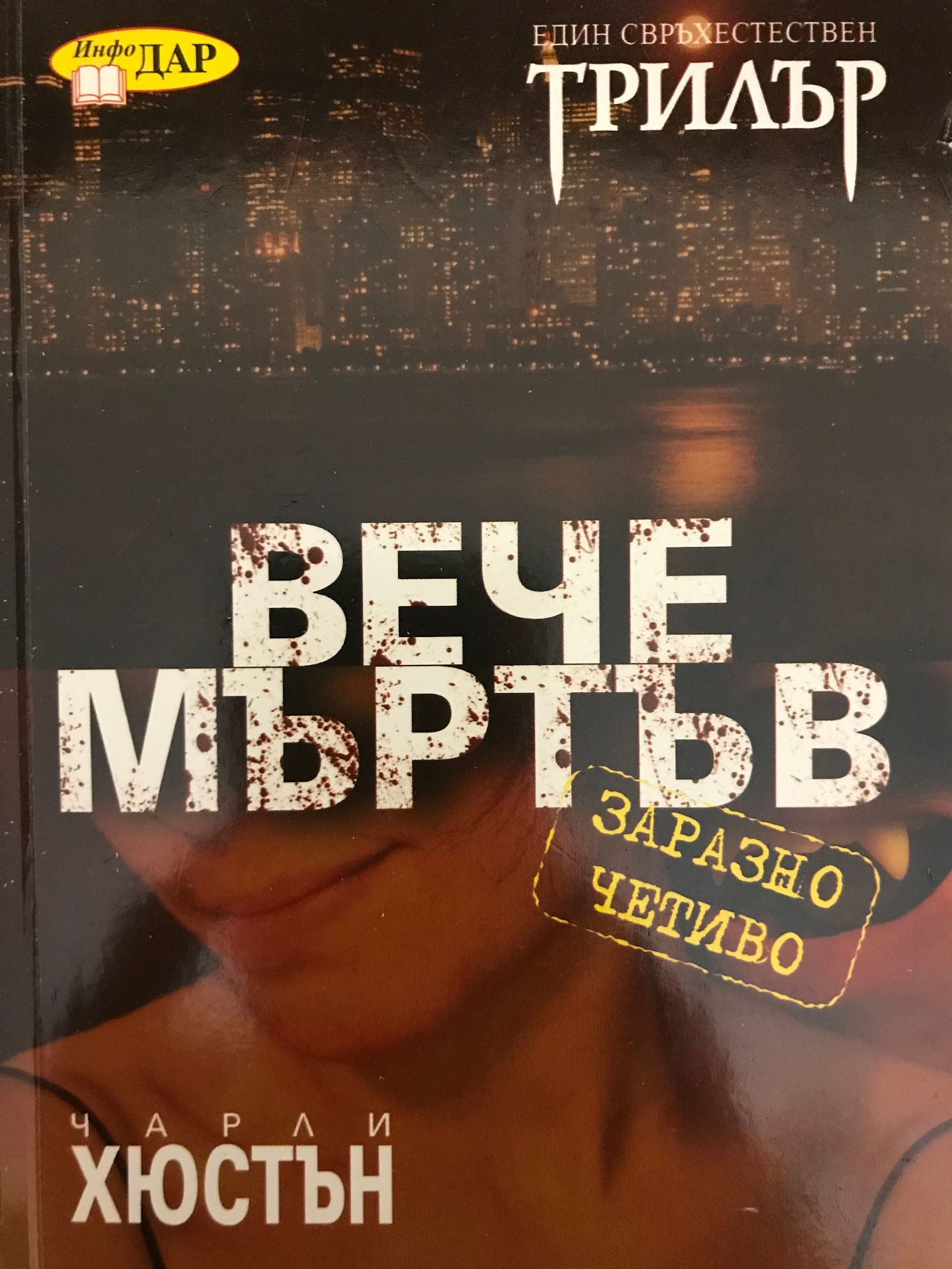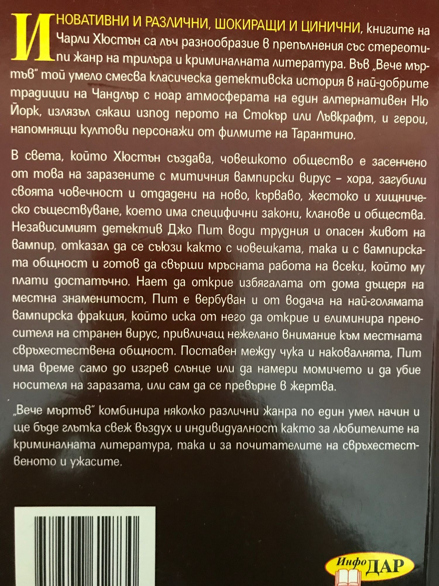 ИНОВАТИВНИ И РАЗЛИЧНИ, ШОКИРАЩИ И ЦИНИЧНИ, книгите на Чарли Хюстън са лъч разнообразие в препълнения със стереотипи жанр на трилъра и криминалната литература. Във "Вече мъртъв" той умело смесва класическа детективска история в най-добрите традиции на Чандлър с ноар атмосферата на един алтернативен Ню Йорк, излязъл сякаш изпод перото на Стокър или Лъвкрафт, и герои, напомнящи култови персонажи от филмите на Тарантино. В света, който Хюстън създава, човешкото общество е засенчено от това на заразените с митичния вампирски вирус – хора, загубили своята човечност и отдадени на ново, кърваво, жестоко и хищническо съществуване, което има специфични закони, кланове и общества. Независимият детектив Джо Пит води трудния и опасен живот на вампир, отказал да се съюзи както с човешката, така и с вампирската общност и готов да свърши мръсната работа на всеки, който му плати достатъчно. Нает да открие избягалата от дома дъщеря на местна знаменитост, Пит е вербуван и от водача на най-голямата вампирска фракция, който иска от него да открие и елиминира преносителя на странен вирус, привличащ нежелано внимание към местната свръхестествена общност. Поставен между чука и наковалнята, Пит има време само до изгрев слънце или да намери момичето и да убие носителя на заразата, или сам да се превърне в жертва. "Вече мъртъв" комбинира няколко различни жанра по един умел начин и ще бъде глътка свеж въздух и индивидуалност както за любителите на криминалната литература, така и за почитателите на свръхестественото и ужасите.