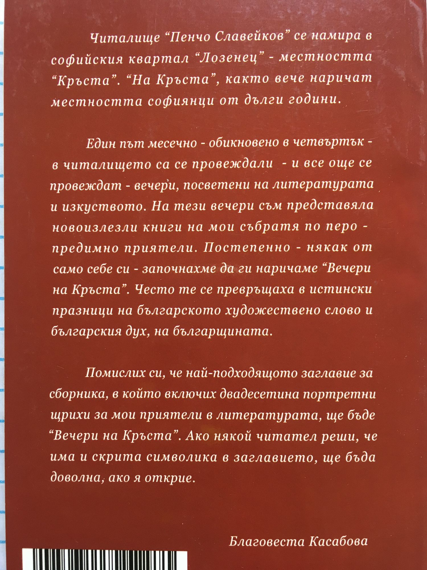 Един път месечно в читалище "Пенчо Славейков", намиращо се в софийския квартал "Лозенец" - местността "Кръста", са се провеждали и все още се провеждат вечери, посветени на литературата и изкуството. На тези вечери се представят новоизлезли книги на български писатели. Постепенно, някак от само себе си, тези сбирки започват да се наричат "Вечери на Кръста". Те често се превръщат в истински празници на българското художествено слово и българския дух, на българщината.
