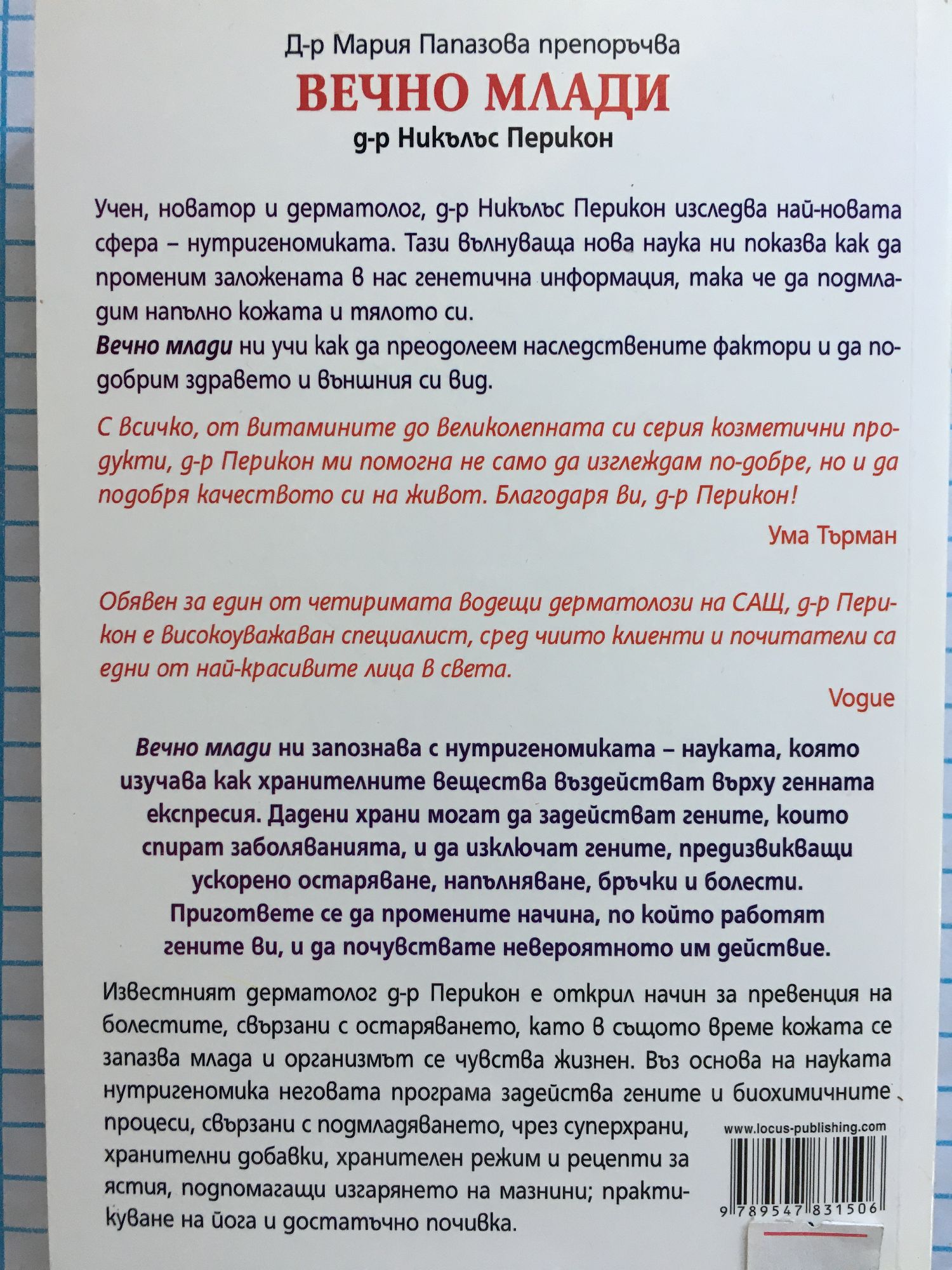 Учен, новатор и дерматолог, д-р Никълъс Перикон изследва най-новата сфера - нутригеномиката. Тази вълнуваща нова наука ни показва как да променим заложената в нас генетична информация, така че да подмладим напълно кожата и тялото си. "Вечно млади" ни учи как да преодолеем наследствените фактори и да подобрим здравето и външния си вид. "Вечно млади" ни запознава с нутригеномиката - науката, която изучава как хранителните вещества въздействат върху генната експресия. Дадени храни могат да задействат гените, които спират заболяванията, и да изключат гените, предизвикващи ускорено остаряване, напълняване, бръчки и болести. Пригответе се да промените начина, по който работят гените ви, и да почувствате невероятното им действие. Известният дерматолог д-р Перикон е открил начин за превенция на болестите, свързани с остаряването, като в същото време кожата се запазва млада и организмът се чувства жизнен. Въз основа на науката нутригеномика неговата програма задейства гените и биохимичните процеси, свързани с подмладяването, чрез суперхрани, хранителни добавки, хранителен режим и рецепти за ястия, подпомагащи изгарянето на мазнини; практикуване на йога и достатъчна почивка.
