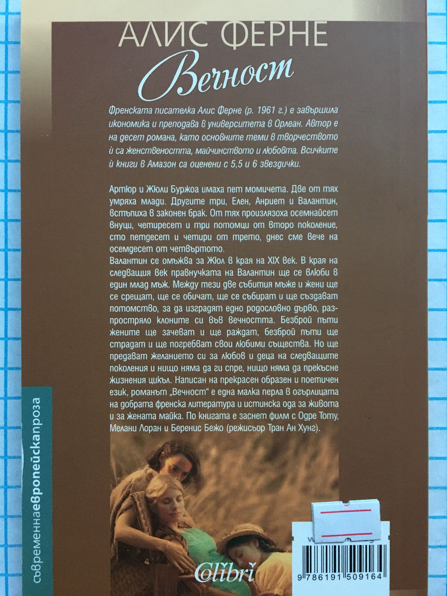 Артюр и Жюли Буржоа имаха пет момичета. Две от тях умряха млади. Другите три, Елен, Анриет и Валантин, встъпиха в законен брак. От тях произлязоха осемнайсет внуци, четиресет и три потомци от второ поколение, сто петдесет и четири от трето, днес сме вече на осемдесет от четвъртото. Валантин се омъжва за Жюл в края на XIX век. В края на следващия век правнучката на Валантин ще се влюби в един млад мъж. Между тези две събития мъже и жени ще се срещат, ще се обичат, ще се събират и ще създават потомство, за да изградят едно родословно дърво, разпростряло клоните си във вечността. Безброй пъти жените ще зачеват и ще раждат, безброй пъти ще страдат и ще погребват свои любими същества. Но ще предават желанието си за любов и деца на следващите поколения и нищо няма да ги спре, нищо няма да прекъсне жизнения цикъл. Написан на прекрасен образен и поетичен език, романът „Вечност” е една малка перла в огърлицата на добрата френска литература и истинска ода за живота и за жената майка. По книгата е заснет филм с Одре Тоту, Мелани Лоран и Беренис Бежо (режисьор Тран Ан Хунг).