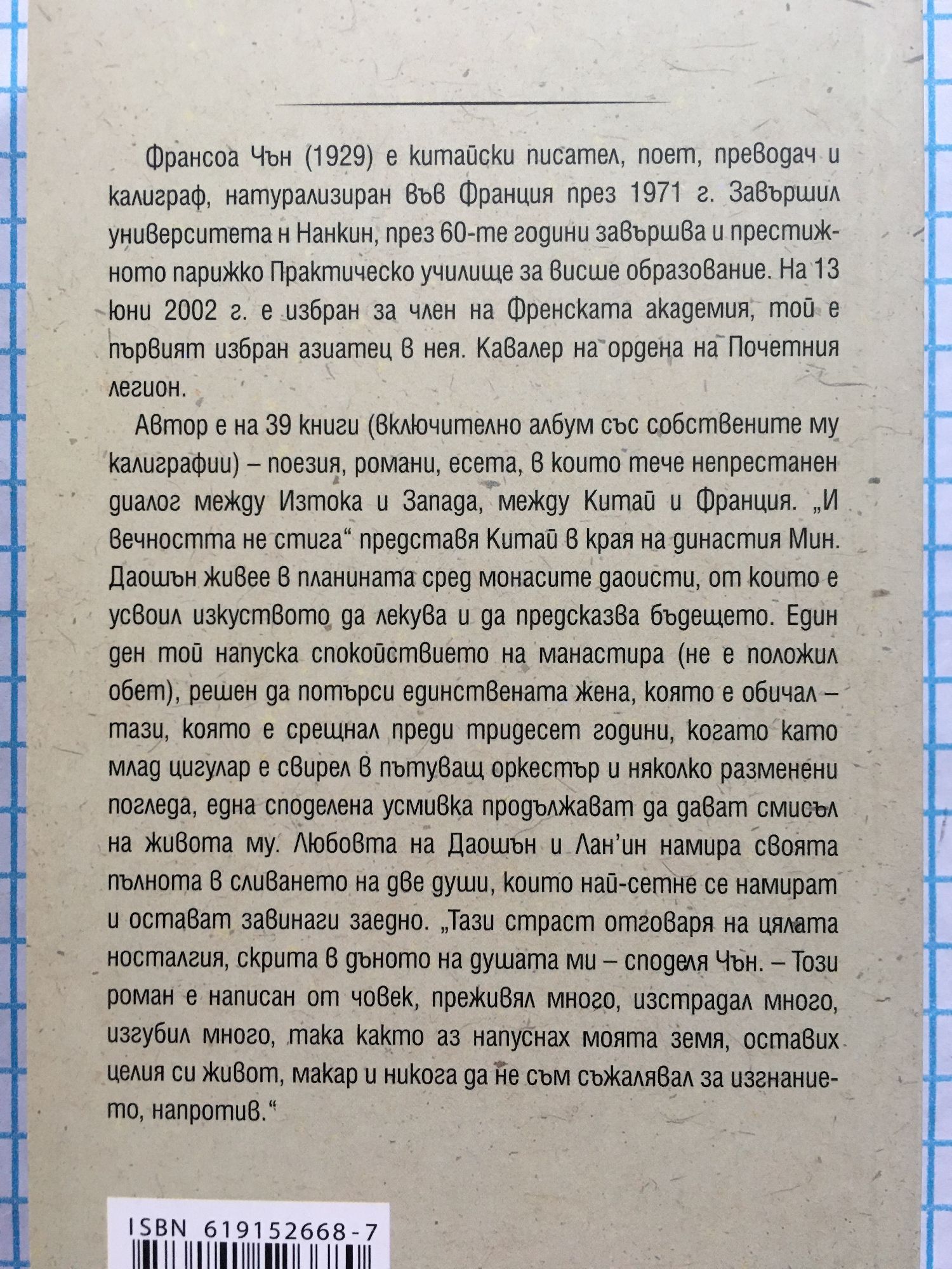 Франсоа Чън (1929) е китайски писател, поет, преводач и калиграф, натурализиран във Франция през 1971 г. Завършил университета н Нанкин, през 60-те години завършва и престижното парижко Практическо училище за висше образование. На 13 юни 2002 г. е избран за член на Френската академия, той е първият избран азиатец в нея. Кавалер на ордена на Почетния легион. Автор е на 39 книги (включително албум със собствените му калиграфии) – поезия, романи, есета, в които тече непрестанен диалог между Изтока и Запада, между Китай и Франция. „И вечността не стига“ представя Китай в края на династия Мин. Даошън живее в планината сред монасите даоисти, от които е усвоил изкуството да лекува и да предсказва бъдещето. Един ден той напуска спокойствието на манастира (не е положил обет), решен да потърси единствената жена, която е обичал – тази, която е срещнал преди тридесет години, когато като млад цигулар е свирел в пътуващ оркестър и няколко разменени погледа, една споделена усмивка продължават да дават смисъл на живота му. Любовта на Даошън и Лан’ин намира своята пълнота в сливането на две души, които най-сетне се намират и остават завинаги заедно. „Тази страст отговаря на цялата носталгия, скрита в дъното на душата ми – споделя Чън. – Този роман е написан от човек, преживял много, изстрадал много, изгубил много, така както аз напуснах моята земя, оставих целия си живот, макар и никога да не съм съжалявал за изгнанието, напротив.“