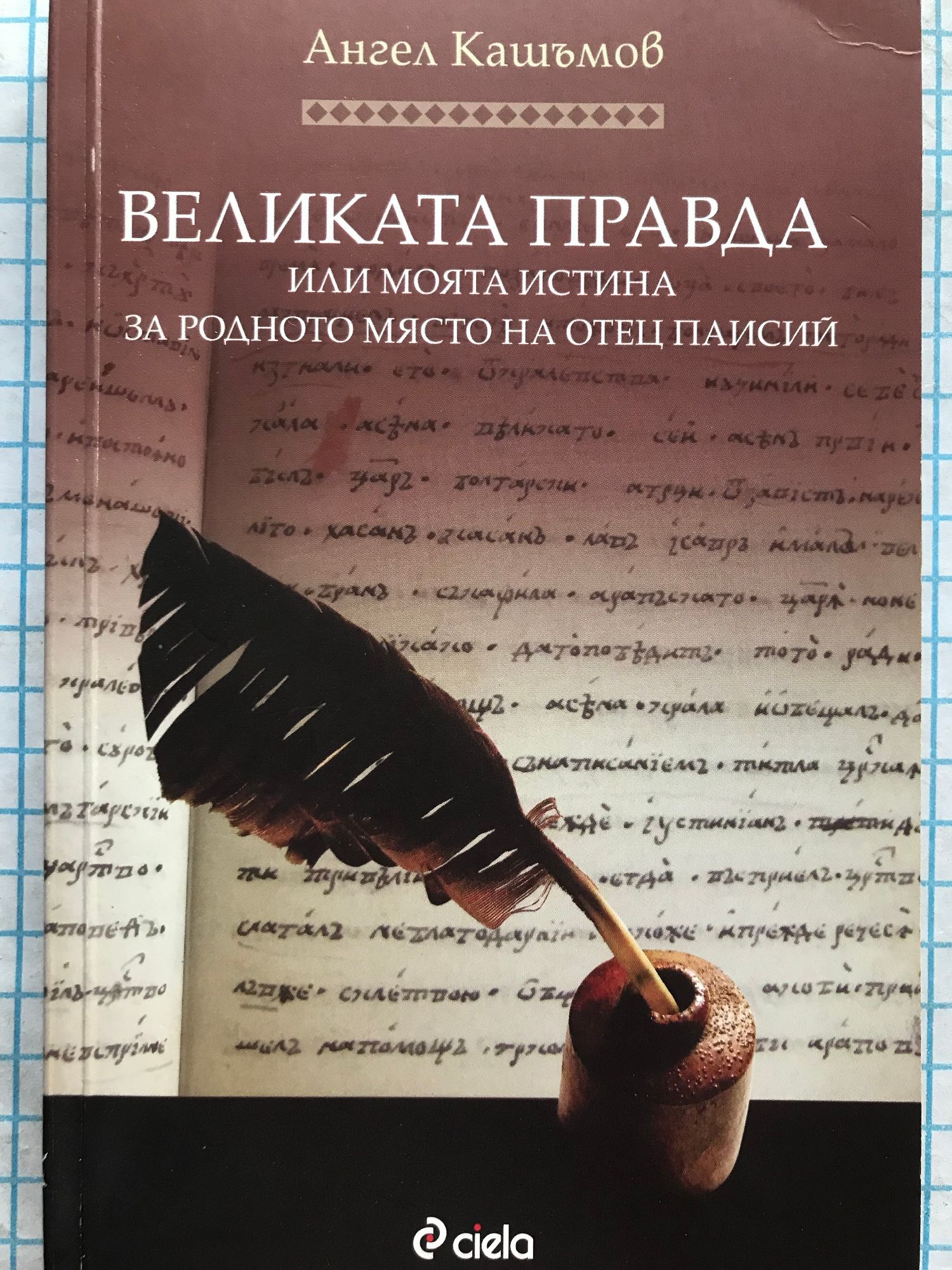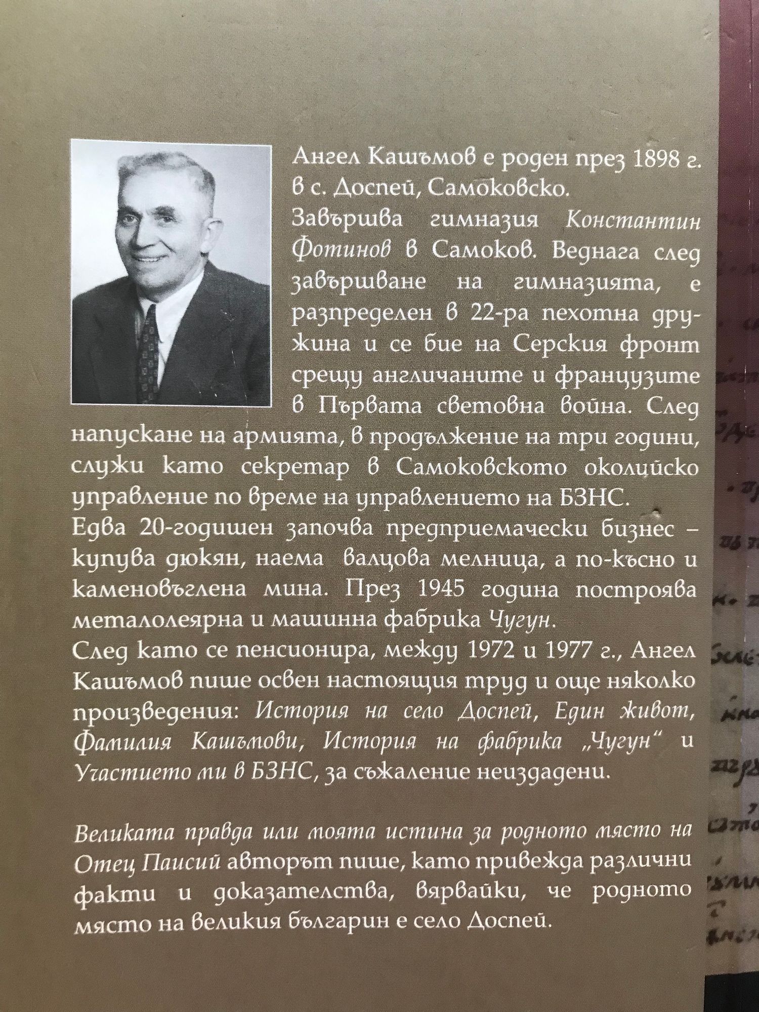 "Великата правда или моята истина за родното място на Отец Паисий" авторът пише, като привежда различни факти и доказателства, вярвайки, че родното място на великия българин е село Доспей. Ангел Кашъмов е роден през 1898 г. в с.Доспей, Самоковско. Завършва гимназия "Константин Фотинов" в Самоков. Веднага след това е разпределен в 22-ра пехотна дружина и се бие на Серския фронт срещу англичаните и французите в Първата световна война. След напускане на армията, в продължение на три години, служи като секретар в Самоковското околийско управление по време на управлението на БЗНС. През 1945 година построява металолеярна и машинна фабрика "Чугун". След като се пенсионира, между 1972-1977 г., Ангел Кашъмов пише освен настоящия труд и още няколко произведения: "История на село Доспей", "Един живот", "Фамилия Кашъмови", История на фабрика "Чугун" и "Участието ми в БЗНС", за съжаление неиздадени.
