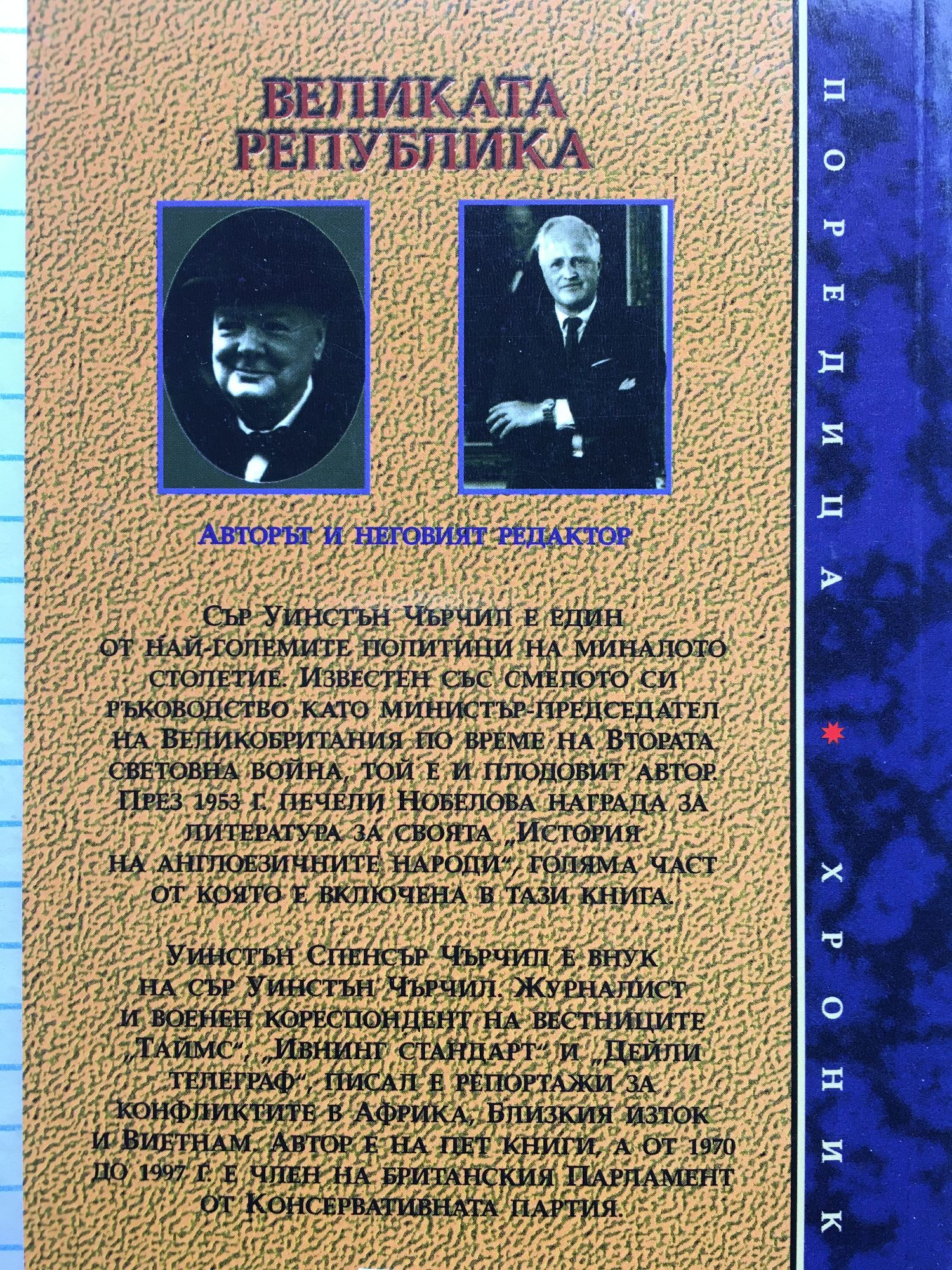 Сър Уинстън Чърчил е един от най-големите политици на миналото столетие. Известен със смелото си ръководство като министър-председател на Великобритания по време на Втората световна война, той е и плодовит автор. През 1953 г. печели Нобелова награда за литература за своята "История на англоезичните народи", голяма част от която е включена в тази книга. "Тази изключителна книга е венецът на произведенията и наблюденията на Уинстън Чърчил върху американската история."