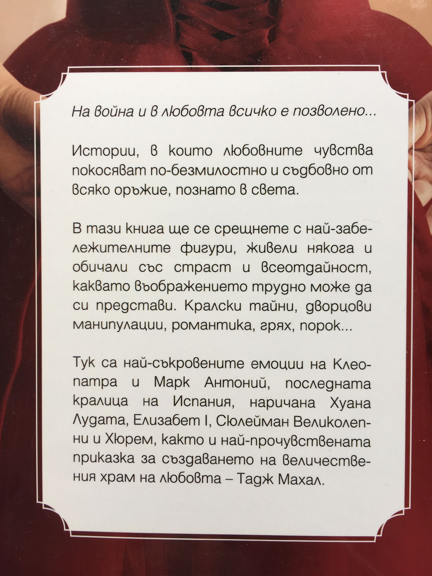 На война и в любовта всичко е позволено... В тази книга ще се срещнете с най-забележителните фигури, живeли някога и обичали със страст и всеотдайност, каквато въображението трудно може да си представи. Кралски тайни, дворцови манипулации, романтика, грях, порок... Тук са най-съкровените емоции на Клеопатра и Марк Антоний, последната кралица на Испания, наричана Хуана Лудата, Елизабет I, Сюлейман Великолепни и Хюрем, както и най-прочувствената приказка за създаването на величествения храм на любовта – Тадж Махал.