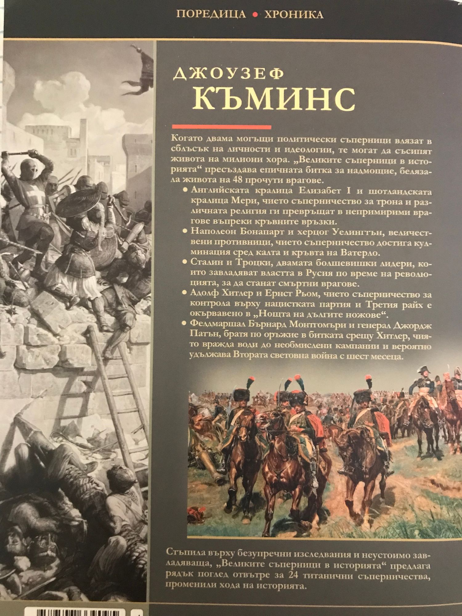 Когато двама могъщи политически съперници влязат в сблъсък на личности и идеологии, те могат да съсипят живота на милиони хора. „Великите съперници в историята“ пресъздава епичната битка за надмощие, белязала живота на 48 прочути врагове. Английската кралица Елизабет I и шотландската кралица Мери, чието съперничество за трона и различната религия ги превръщатг в непримирими врагове въпреки кръвните връзки. Наполеон Бонапарт и херцог Уелингтън, величествени противници, чието съперничество достига кулминация сред калта и кръвта на Ватерло. Сталин и Троцки, двамата болшевишки лидери, които завладяват властта в Русия по време на революцията, за да станат смъртни врагове. Адолф Хитлер и Ернст Рьом, чието съперничество за контрола върху нацистката партия и Третия райх е окървавено в „Нощта на дългите ножове“. Фелдмаршал Бърнард Монтгомъри и генерал Джордж Патън, братя по оръжие в битката срещу Хитлер, чиято вражда води до необмислени кампании и вероятно удължава Втората световна война с шест месеца. Стъпила върху безупречни изследвания и неустоимо завладяваща, „Великите съперници в историята“ предлага рядък поглед отвътре за 24 титанични съперничества, променили хода на историята.