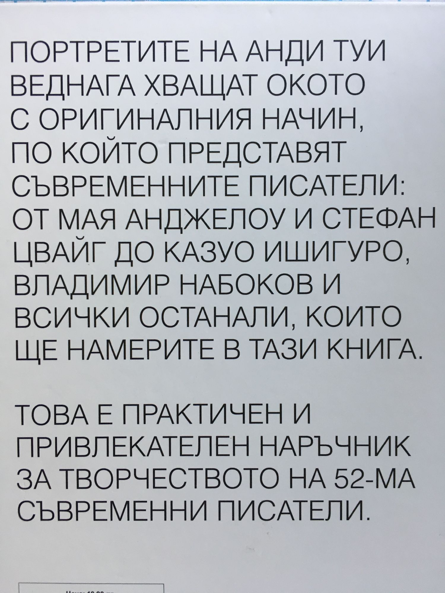 Луксозно издание, илюстрирано от популярния художник Анди Туи, съдържащо по 52-ма изявени представители на литературата на 20 век. Информацията за всеки един творец е синтезирана, но пълнокръвна и изчерпателна, придружена от множество снимки, цитати и уникален портрет.