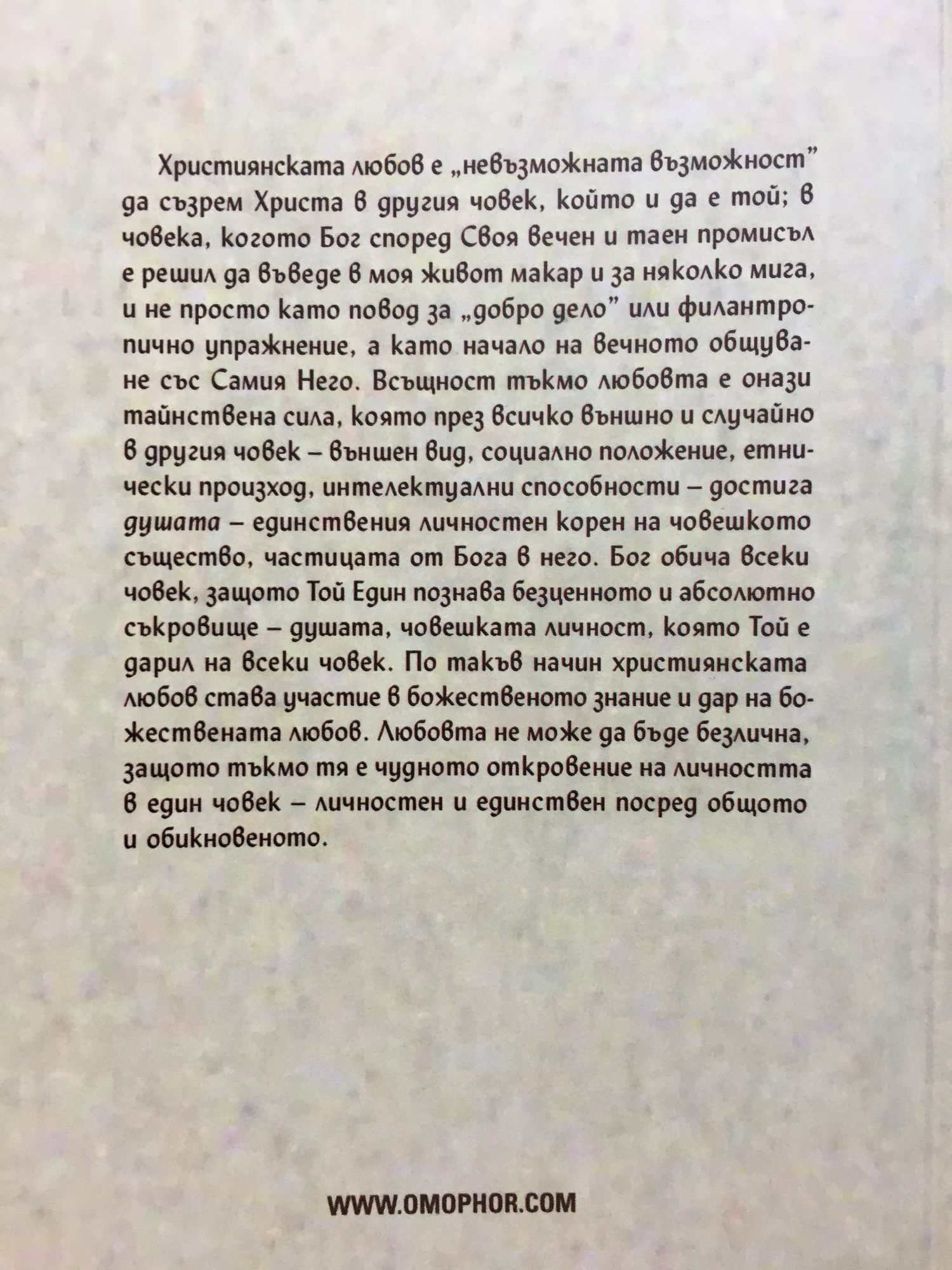 Християнската любов е „невъзможната възможност" да съзрем Христа в другия човек, който и да е той; в човека, когото Бог според Своя вечен и таен промисъл е решил да въведе в моя живот макар и за няколко мига, и не просто като повод за „добро дело" или филантропично упражнение, а като начало на вечното общуване със Самия Него. Всъщност тъкмо любовта е онази тайнствена сила, която през всичко външно и случайно в другия човек - външен вид, социално положение, етнически произход, интелектуални способности - достига душата - единствения личностен корен на човешкото същество, частицата от Бога в него. Бог обича всеки човек, защото Той Един познава безценното и абсолютно съкровище - душата, човешката личност, която Той е дарил на всеки човек. По такъв начин християнската любов става участие в божественото знание и дар на божествената любов. Любовта не може да бъде безлична, защото тъкмо тя е чудното откровение на личността в един човек - личностен и единствен посред общото и обикновеното.