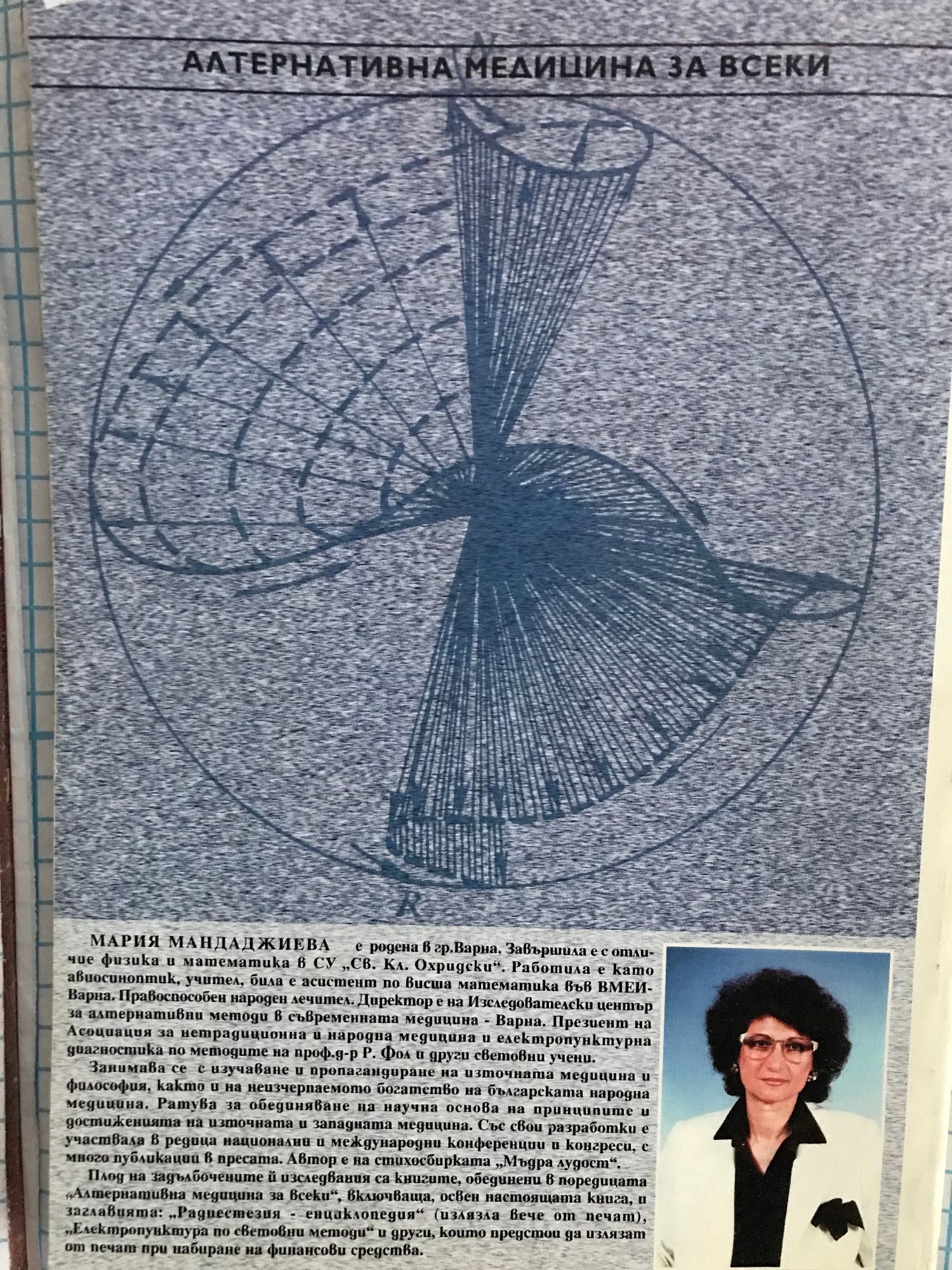 МАРИЯ МАНДАДЖИЕВА е родена в гр.Варна. Завършила е с отличие физика u математика в СУ „Cв. Кл. Охридски". Работила е като авиосиноптик, учител, била e асистент по Вucшa математика във ВМЕИ-Варна. Правоспособен народен лечитеп. Директор е на Изследователски център за алтернативни методи в съвременната медицина - Варна. Президент на Асоциация за нетрадиционна и народна медицина u електропунктурна диагностика пo методите на проф.д-р Р.Фол и други световни учени. Член е на Асоциацията на философите в България, на Асоциацията по акупунктура, на Асоциацията „феномен" u на Клуба на лекарите-писатели в България. Занимава се с изучаване и пропагандиране на източната медицина u философия, както u на неизчерпаемото богатство на българската народна медицина. Paтyвa за обединяване на научна осноВа на принципите и достиженията на източната и западната медицина. Със cвou разработки е участвала в редица национални u международни конференции u конгреси, с много публикации в пресата. Автор е на стихосбирката „Мъдра лудост". Плод на задълбочените и изследвания са книгите, обединени в поредицата „Алтернативна медицина за всеки", включваща, освен настоящата книга, u заглавията: „ВЕЛИКОТО ЕДИНСТВО НА ПРИРОДАТА И ЧОВЕКА", „РАДИЕСТЕЗИЯ - енциклопедия" u дpyгu.