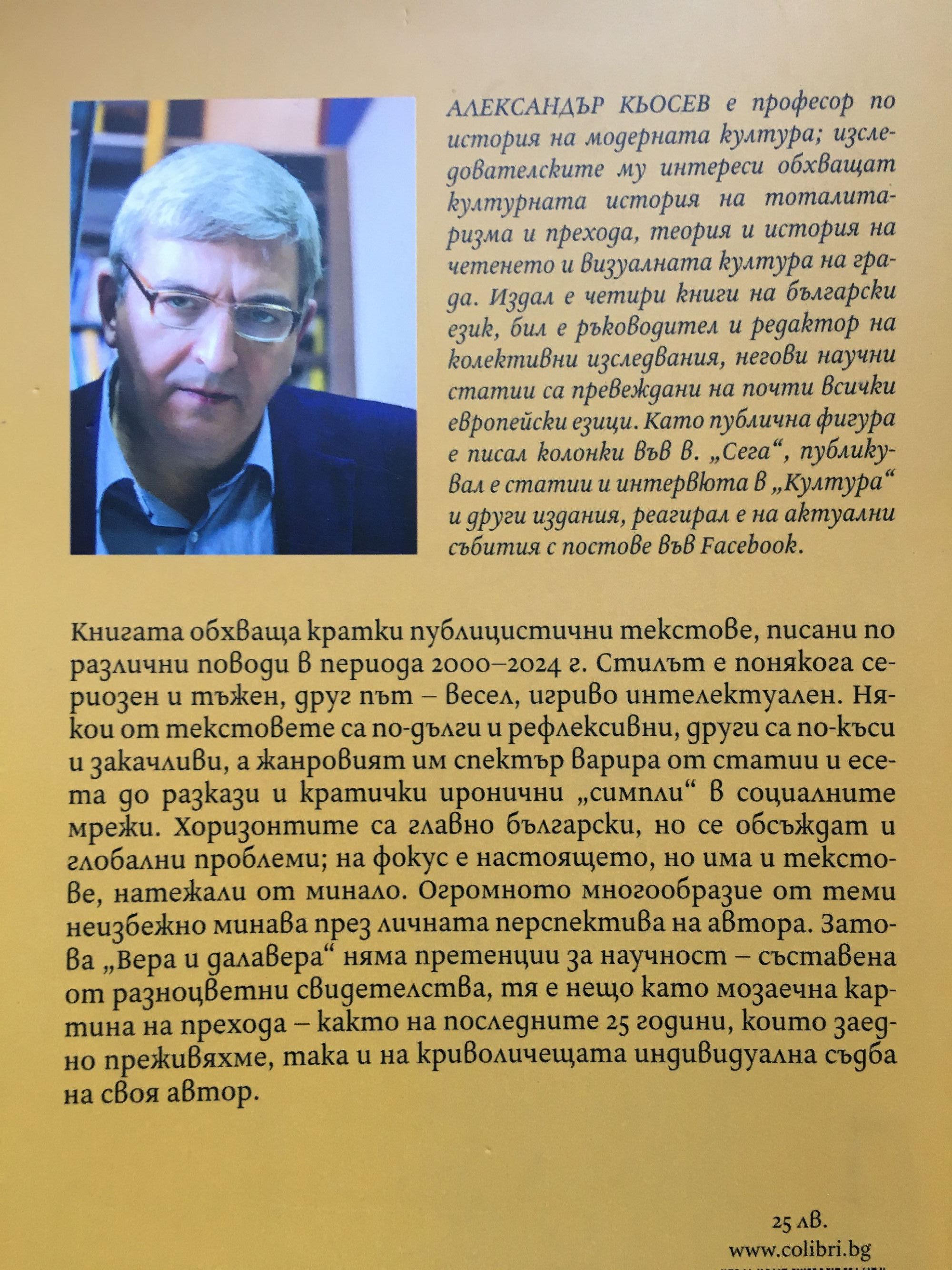 Книгата обхваща кратки публицистични текстове, писани по различни поводи в периода 2000 - 2023 г. Стилът е понякога сериозен и тъжен, друг път - весел, игриво интелектуален. Някои от текстовете са по-дълги и рефлексивни, други са по-къси и закачливи, а жанровият им спектър варира от статии и есета до разкази и кратички иронични "симпли" в социалните мрежи. Хоризонтите са главно български, но се обсъждат и глобални проблеми; на фокус е настоящето, но има и текстове, натежали от минало. Огромното многообразие от теми неизбежно минава през личната перспектива на автора. Затова Вера и далавера няма претенции за научност - съставена от разноцветни свидетелства, тя е нещо като мозаечна картина на прехода - както на последните 25 години, които заедно преживяхме, така и на криволичещата индивидуална съдба на своя автор. Александър Кьосев е професор по история на модерната култура; изследователските му интереси обхващат културната история на тоталитаризма и прехода, теория и история на четенето и визуалната култура на града. Издал е четири книги на български език, бил е ръководител и редактор на колективни изследвания, негови научни статии са превеждани на почти всички европейски езици. Като публична фигура е писал колонки във в. Сега, публикувал е статии и интервюта в Култура и други издания, реагирал е на актуални събития с постове във Facebook.