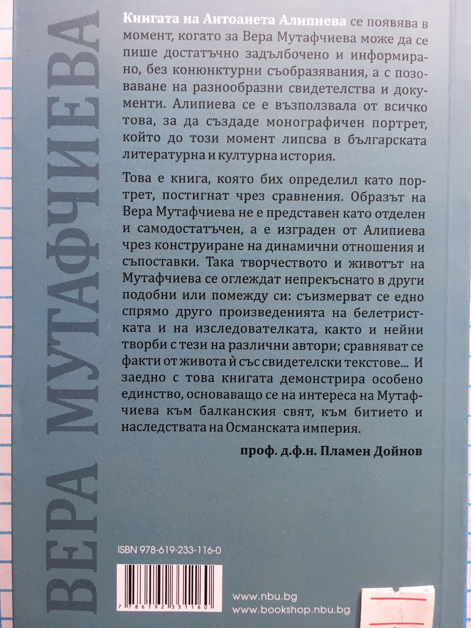 Книгата на Антоанета Алипиева се появява в момент, когато за Вера Мутафчиева може да се пише достатъчно задълбочено и информирано, без конюнктурни съобразявания, а с позоваване на разнообразни свидетелства и документи. Алипиева се е възползвала от всичко това, за да създаде монографичен портрет, който до този момент липсва в българската литературна и културна история. Това е книга, която бих определил като портрет, постигнат чрез сравнения. Образът на Вера Мутафчиева не е представен като отделен и самодостатъчен, а е изграден от Алипиева чрез конструиране на динамични отношения и съпоставки. Така творчеството и животът на Мутафчиева се оглеждат непрекъснато в други подобни или помежду си: съизмерват се едно спрямо друго произведенията на белетристката, както и нейни творби с тези на различни автори; сравняват се факти от живота ѝ със свидетелски текстове... И заедно с това книгата демонстрира особено единство, основаващо се на интереса на Мутафчиева към балканския свят, към битието и наследствата на Османска-та империя.