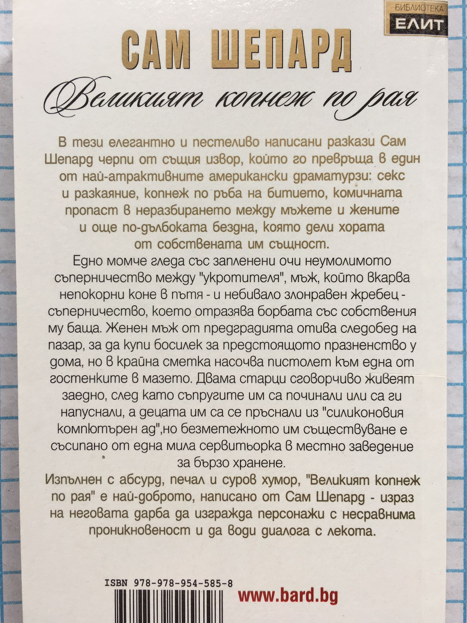 В тези елегантно и пестеливо написани разкази Сам Шепард черпи от същия извор, който го превръща в един от най-атрактивните американски драматурзи: секс и разкаяние, копнеж по ръба на битието, комичната пропаст в неразбирането между мъжете и жените и още по-дълбоката бездна, която дели хората от собствената им същност. Едно момче гледа със запленени очи неумолимото съперничество между “укротителя”, мъж, който вкарва непокорни коне в пътя - и небивало злонравен жребец - съперничество, което отразява борбата със собствения му баща. Женен мъж от предградията отива следобед на пазар, за да купи босилек за предстоящото празненство у дома, но в крайна сметка насочва пистолет към една от гостенките в мазето. Двама старци сговорчиво живеят заедно, след като съпругите им са починали или са ги напуснали, а децата им са се пръснали из “силиконовия компютърен ад”, но безметежното им съществуване е съсипано от една мила сервитьорка в местно заведение за бързо хранене. Изпълнен с абсурд, печал и суров хумор, “Великият копнеж по рая” е най-доброто, написано от Сам Шепард - израз на неговата дарба да изгражда персонажи с несравнима проникновеност и да води диалога с лекота.