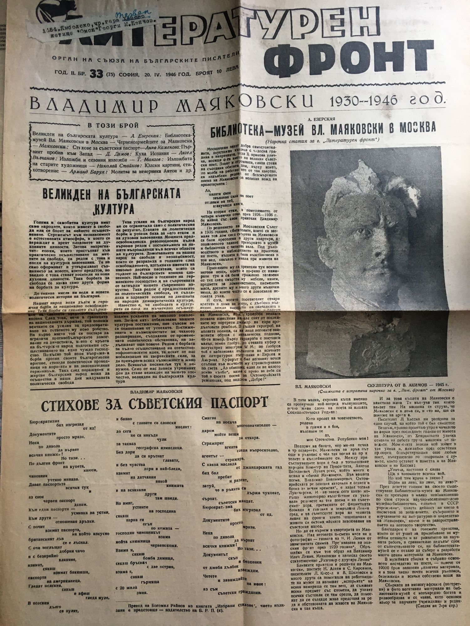 Вестник "Литературен фронт" - год. II, бр. 33 (75). София, 20. IV. 1946 г.