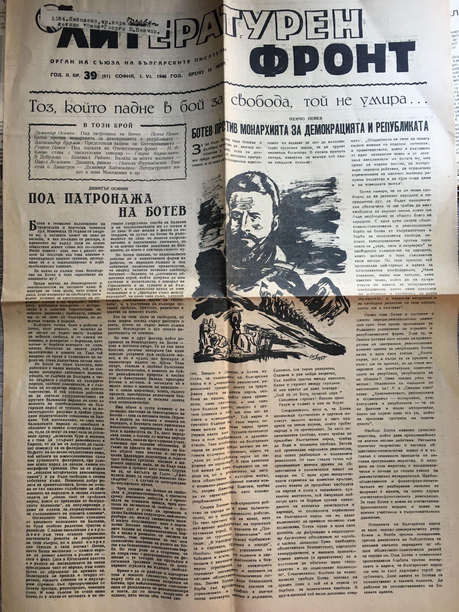 Вестник "Литературен фронт" - год. II, бр. 39 (81). София, 1. VI. 1946 г.
