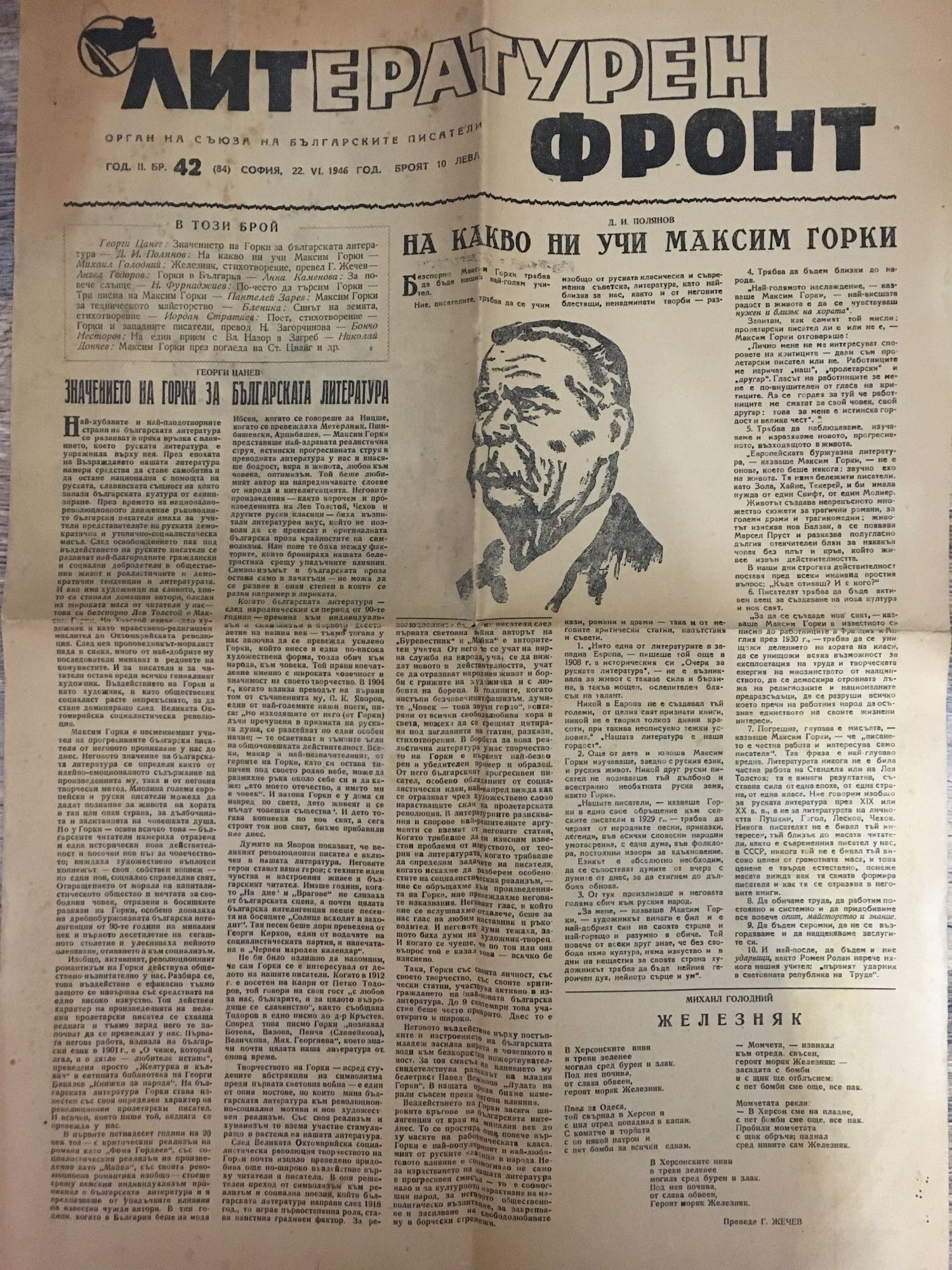 Вестник "Литературен фронт" - год. II, бр. 42 (84). София,, 22. VI. 1946 г.