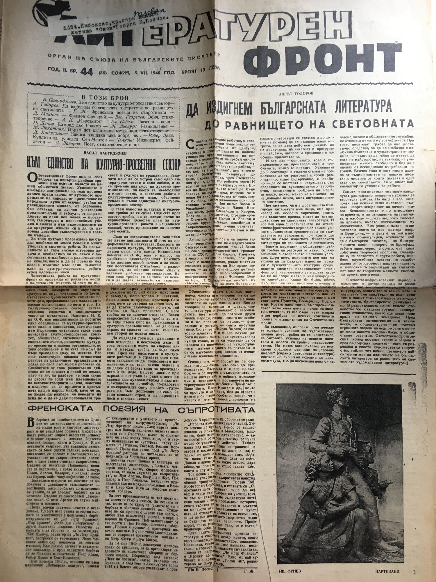 Вестник "Литературен фронт" - год. II, бр. 44 (86). София, 6. VII. 1946 г.