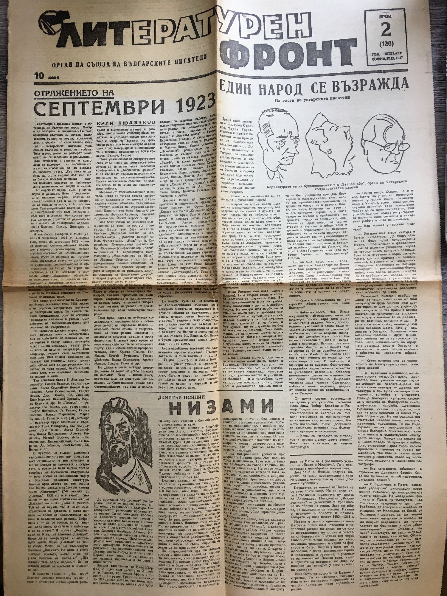 Вестник "Литературен фронт" - год. IV, бр. 2 (128). София, 27. IX. 1947 г.