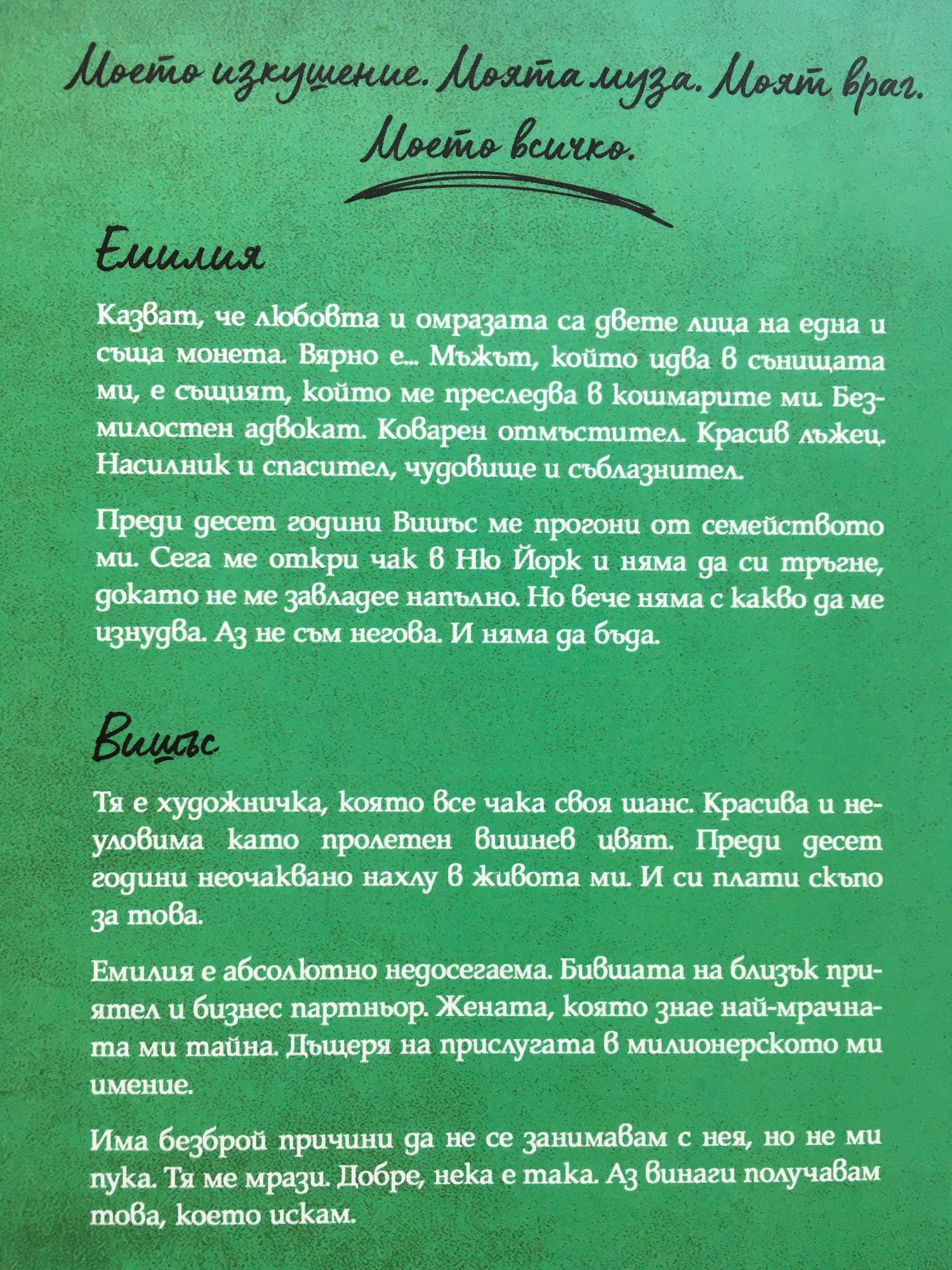 Вишъс. Моето изкушение. Моята муза. Моят враг. Моето всичко. Емилия: "Казват, че любовта и омразата са двете лица на една и съща монета. Вярно е... Мъжът, който идва в сънищата ми, е същият, който ме преследва в кошмарите ми. Безмилостен адвокат. Коварен отмъстител. Красив лъжец. Насилник и спасител, чудовище и съблазнител. Преди десет години Вишъс ме прогони от семейството ми. Сега ме откри чак в Ню Йорк и няма да си тръгне, докато не ме завладее напълно. Но вече няма с какво да ме изнудва. Аз не съм негова. И няма да бъда." Вишъс: "Тя е художничка, която все чака своя шанс. Красива и неуловима като пролетен вишнев цвят. Преди десет години неочаквано нахлу в живота ми. И си плати скъпо за това. Емилия е абсолютно недосегаема. Бившата на близък приятел и бизнес партньор. Жената, която знае най-мрачната ми тайна. Дъщеря на прислугата в милионерското ми имение. Има безброй причини да не се занимавам с нея, но не ми пука. Тя ме мрази. Добре, нека е така. Аз винаги получавам това, което искам."