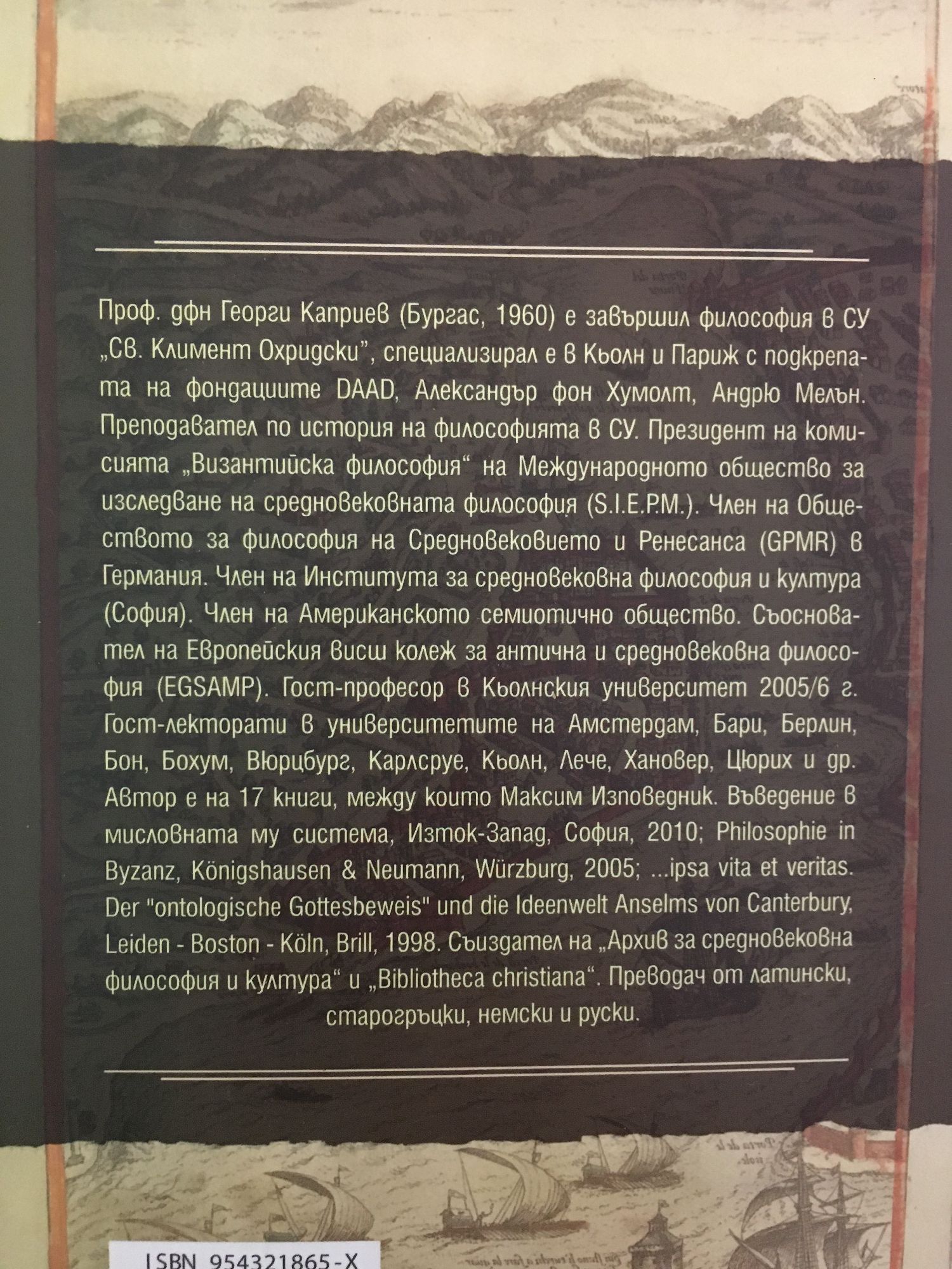 Проф. дфн Георги Каприев (Бургас, 1960) е завършил философия в СУ „Св. Климент Охридски”, специализирал е в Кьолн и Париж с подкрепата на фондациите DAAD, Александър фон Хумболт, Андрю Мелън. Преподава история на философията в СУ. Президент е на комисията „Византийска философия“ на Международното общество за изследване на средновековната философия (S.I.E.P.M.). Член на Обществото за философия на Средновековието и Ренесанса (GPMR) в Германия. Член на Института за средновековна философия и култура (София). Член на Американското семиотично общество. Съосновател на Европейския висш колеж за антична и средновековна философия (EGSAMP). Гост-професор в Кьолнския университет 2005/6 г. Гост-лектор и в университетите на Амстердам, Бари, Берлин, Бон, Бохум, Вюрцбург, Карлсруе, Кьолн, Лече, Хановер, Цюрих и др. Автор е на 17 книги, между които „Максим Изповедник. Въведение в мисловната му система“, Изток-Запад, София, 2010; Philosophie in Byzanz, Königshausen & Neumann, Würzburg, 2005; ...ipsa vita et veritas. Der "ontologische Gottesbeweis" und die Ideenwelt Anselms von Canterbury, Leiden - Boston - Köln, Brill, 1998. Съиздател на „Архив за средновековна философия и култура“ и „Bibliotheca christiana“. Преводач от латински, старогръцки, немски и руски.
