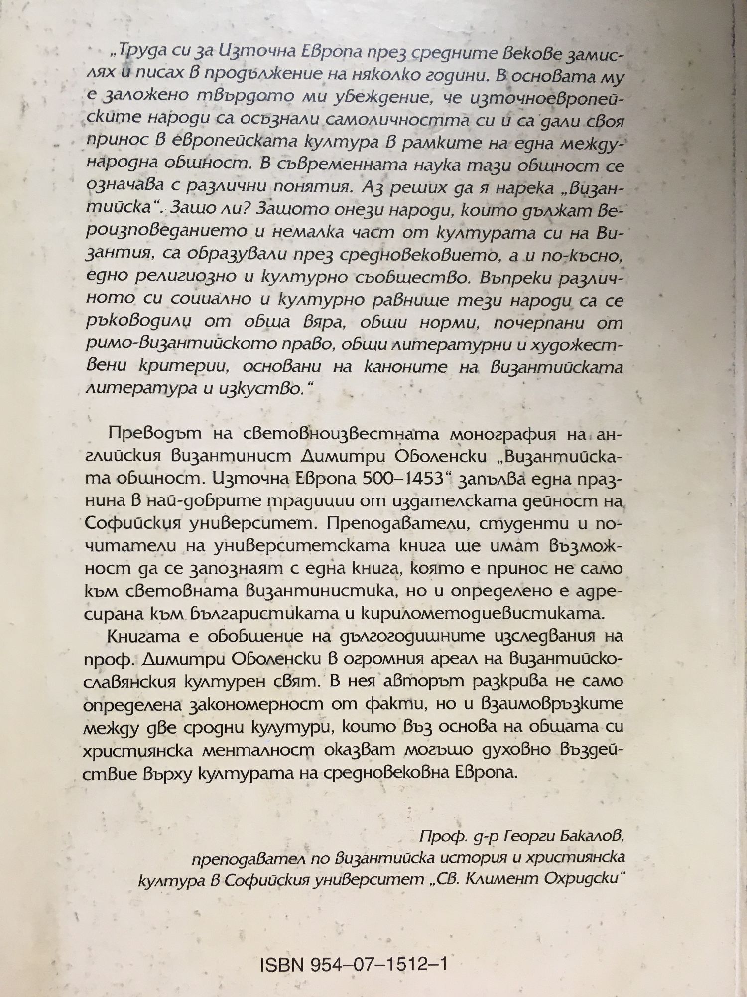 "Труда си за Източна Европа през средните векове замислях и писах в продължение на няколко години. В основата му е заложено твърдото ми убеждение, че източноевропейските народи са осъзнали самоличността си и са дали своя принос в европейската култура в рамките на една международна общност. В съвременната наука тази общност се означава с различни понятия. АЗ реших да я нарека "византийска ". Защо ли? Защото онези народи, които дължат вероизповеданието и немалка част от културата си на Византия, са образували през средновековието, а и по-късно, едно религиозно и културно съобщество. Въпреки различното си социално и културно равнище тези народи са се ръководили от обща вяра, общи норми, почерпани от римо-византийското право, общи литературни и художествени критерии, основани на каноните на византийската литература и изкуство." Димитри Оболенски Преводът на световноизвестната монография на английския византинист Димитри Оболенски "Византийската общност, източна Европа 500-1453" запълва една празнина в най-добрите традиции от издателската дейност на Софийския университет. Преподаватели, студенти и почитатели на университетската книга ще имат възможност да се запознаят с една книга, която е принос не само към световната византинистика, но и определено е адресирана към българистиката и кирилометодиевистиката. Книгата е обобщение на дългогодишните изследвания на проф. Димитри Оболенски в огромния ареал на Византийско-славянския културен свят. В нея авторът разкрива не само определена закономерност от факти, но и взаимовръзките между две сродни култури, които въз основа на общата си християнска менталност оказват могъщо духовно въздействие върху културата на средновековна Европа. Проф. д-р Георги Бакалов, преподавател по византийска история и християнска култура в Софийския университет "Св. Климент Охридски"