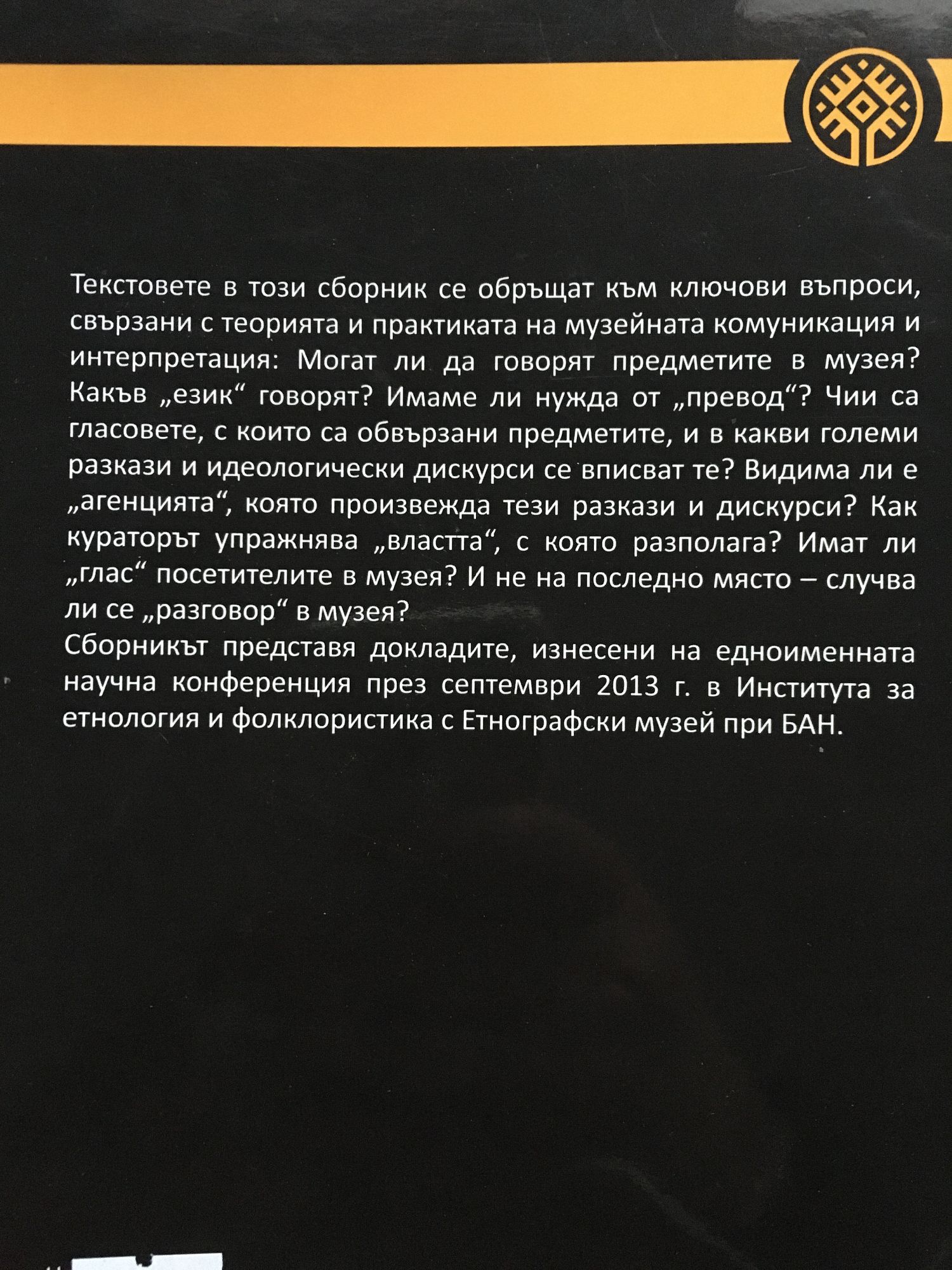 Текстовете в този сборник се обръщат към ключови въпроси, свързани с теорията и практиката на музейната комуникация и интерпретация: Могат ли да говорят предметите в музея? Какъв "език" говорят? Имаме ли нужда от "превод"? Чии са гласовете, с които са обвързани предметите, и в какви големи разкази и идеологически дискурси се вписват те? Видима ли е "агенцията", която произвежда тези разкази и дискурси? Как кураторът упражнява "властта", с която разполага? Имат ли "глас" посетителите в музея? И не на последно място - случва ли се "разговор" в музея? Сборникът представя докладите, изнесени на едноименната научна конференция през септември 2013 г. в Института за етнология и фолклористика с Етнографски музей при БАН.