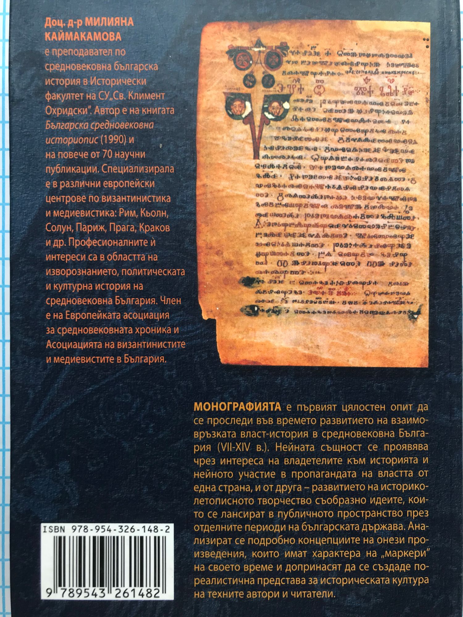Доц. д-р МИЛИЯHA КАЙМАКАМОВА е преподавател по средновековна българска история в Исторически факултет на СУ „Св. Климент Охридски". Автор е на книгата Българска средновековна историопис (1990) и на повече от 70 научни публикации.Специализирала е в различни европейски центрове по византинистика и медиевистика: Рим, Кьолн, Солун, Париж, Прага, Краков и др. Професионалните й интереси са в областта на изворознанието, политическата средновековна България. Член е на Европейката асоциация за средновековната хроника и Асоциацията на византинистите и медиевистите в България. Монографията "Власт и история в средновековна България" е първият цялостен опит да се проследи във времето развитието на взаимовръзката власт-история в България през VII - XIV в. В книгата се анализират подробно концепциите на онези произведения, които имат характера на „маркери" на своето време и допринасят да се създаде по-реалистична представа за историческата култура на техните автори и читатели.