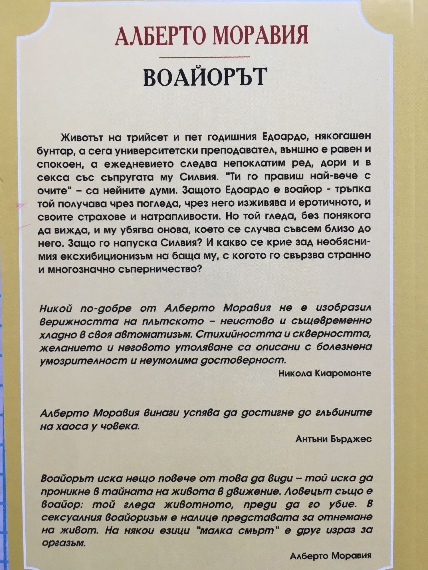 Животът на трийсет и пет годишния Едоардо, някогашен бунтар, а сега университетски преподавател, външно е равен и спокоен, а ежедневието следва непоклатим ред, дори и в секса със съпругата му Силвия. "Ти го правиш най-вече с очите" - са нейните думи. Защото Едоардо е воайор - тръпка той получава чрез погледа, чрез него изживява и еротичното, и своите страхове и натрапливости. Но той гледа, без понякога да вижда, и му убягва онова, което се случва съвсем близо до него. Защо го напуска Силвия? И какво се крие зад необяснимия ексхибиционизъм на баща му, с когото го свързва странно и многозначно съперничество? Никой по-добре от Алберто Моравия не е изобразил верижността на плътското - неистово и същевременно хладно в своя автоматизъм. Стихийността и скверността, желанието и неговото утоляваме са описани с болезнена умозрителност и неумолима достоверност. Никола Киаромонте Алберто Моравия винаги успява да достигне до глъбините на хаоса у човека. Антъни Бърджес Воайорът иска нещо повече от това да види - той иска да проникне в тайната на живота в движение. Ловецът също е воайор: той гледа животното, преди да го убие. В сексуалния воайоризъм е налице представата за отнемане на живот. На някои езици "малка смърт" е друг израз за оргазъм. Алберто Моравия