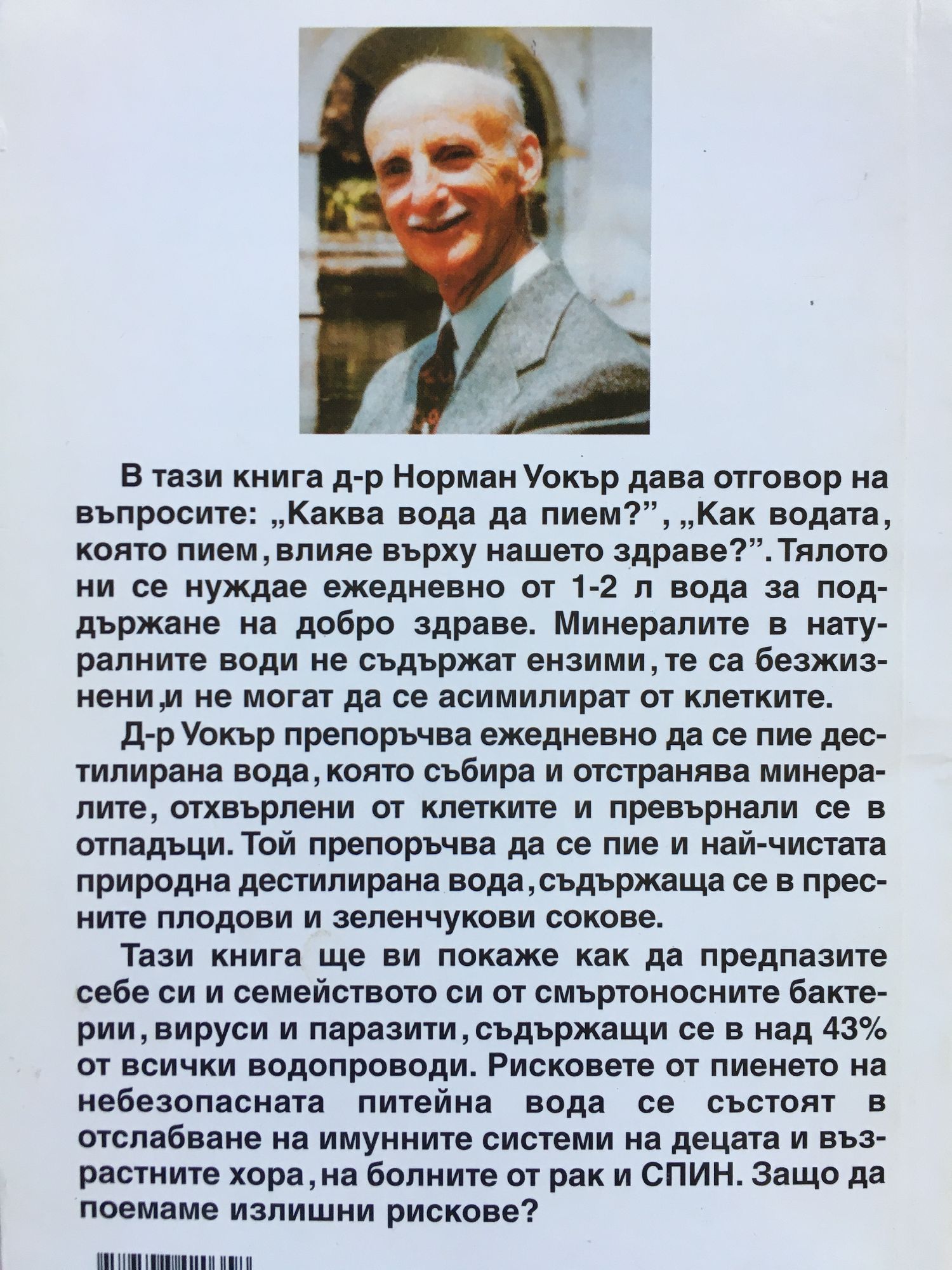 В тази книга д-р Норма Уокър дава отговор на въпросите: "Каква вода пием?", "Как водата, която пием, влияе върху нашето здраве?". Тялото ни се нуждае ежедневно от 1-2 л вода за поддържане на добро здраве. Минералите в натуралните води не съдържат ензими, те са безжизнени, и не могат да се асимилират от клетките. Д-р Уокър препоръчва ежедневно да се пие дестилирана вода, която събира и отстранява минералите, отхвърлени от клетките и превърнали се в отпадъци. Той препоръчва да се пие и най-чистата природна дестилирана вода, съдържаща се в пресните плодови и зеленчукови сокове. Тази книга ще ви покаже как да предпазите себе си и семейството си от смъртоносните бактерии, вируси и паразити, съдържащи се в над 43% от всички водопроводи. Рисковете от пиенето на небезопасната питейна вода се състоят в отслабване на имунните системи на децата и възрастните хора, на болните от рак и СПИН. Защо да поемаме излишни рискове?
