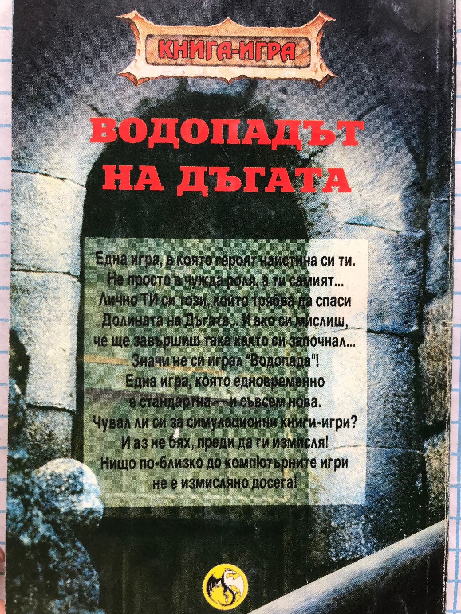 Една игра, в която героят наистина си ти. Не просто в чужда роля, а ти самият... Лично ТИ си този, който трябва да спаси Долината на Дъгата... И ако си мислиш, че ще завършиш така както си започнал... Значи не си играл "Водопада"! Една игра, която едновременно е стандартна - и съвсем нова. Чувал ли си за симулационни книги-игри? И аз не бях, преди да ги измисля! Нищо по-близко до компютърните игри не е измисляно досега!