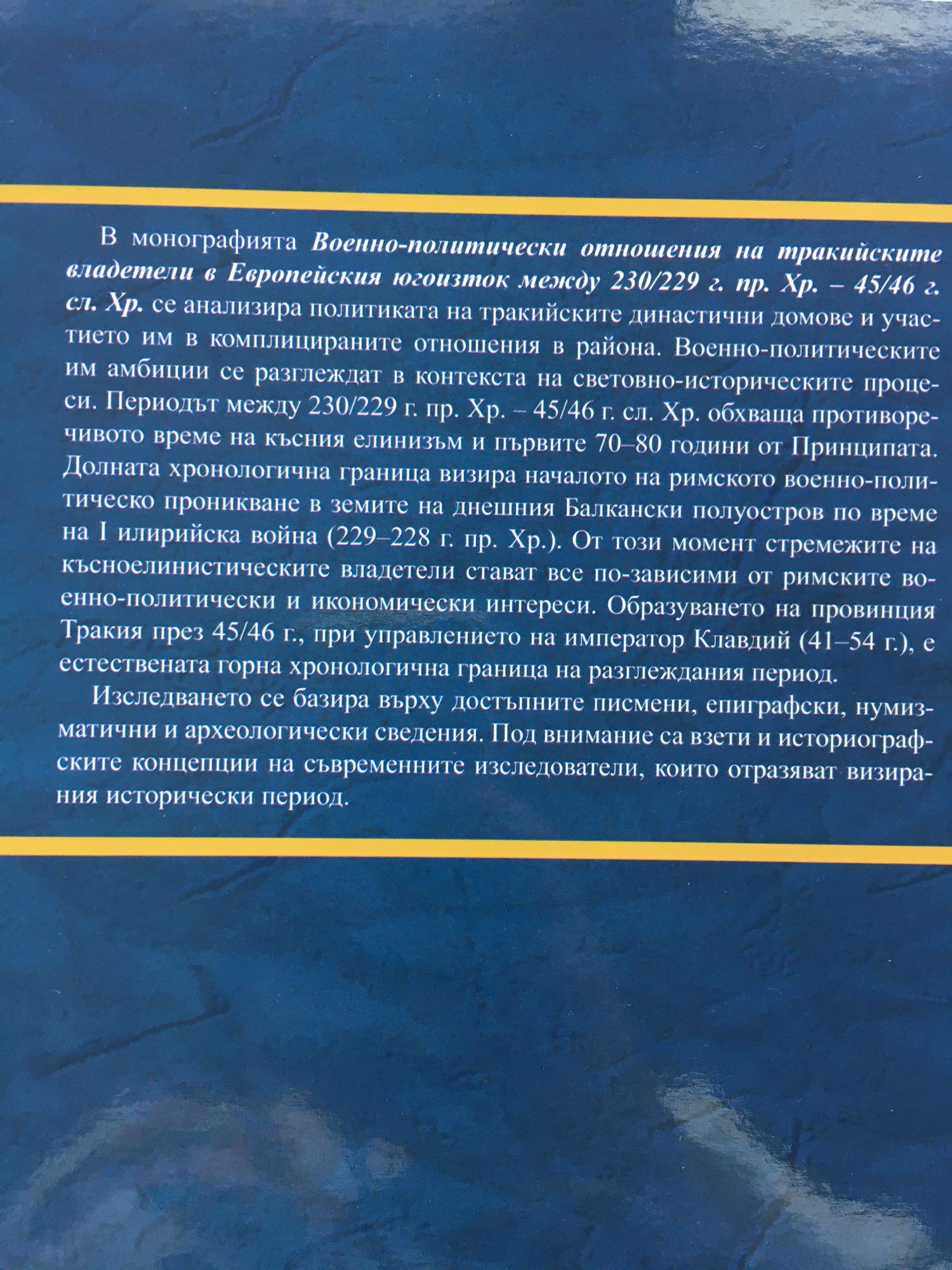 В монографията Военно-политически отношения на тракийските владетели в Европейския югоизток между 230/229 г. пр. Хр. - 45/46 г. сл. Хр. се анализира политиката на тракийските династични домове и участието им в комплицираните отношения в района. Военно-политическите им амбиции се разглеждат в контекста на световно-историческите процеси. Периодът между 230/229 г. пр. Хр. 45/46 г. сл. Хр. обхваща противоречивото време на късния елинизъм и първите 70-80 години oт Принципата. Долната хронологична граница визира началото па римското военнополитическо проникване в земите на днешния Балкански полуостров по време па I илирийска война (229-229 г. пр. Хр.). Oт този момент стремежите на късноелинистическите владетели стават все по-зависими от римските военно-политически и икономически интереси. Образуването на провинция Тракия през 45/46 г., при управлението на император Клавдий (41 54 г.), е естествената горна хронологична граница на разглеждания период. Изследването се базира върху достъпните писмени, епиграфски, нумизматични и археологически сведения. Под внимание са взети и историографските концепции на съвременните изследователи, които отразяват визирания исторически период.