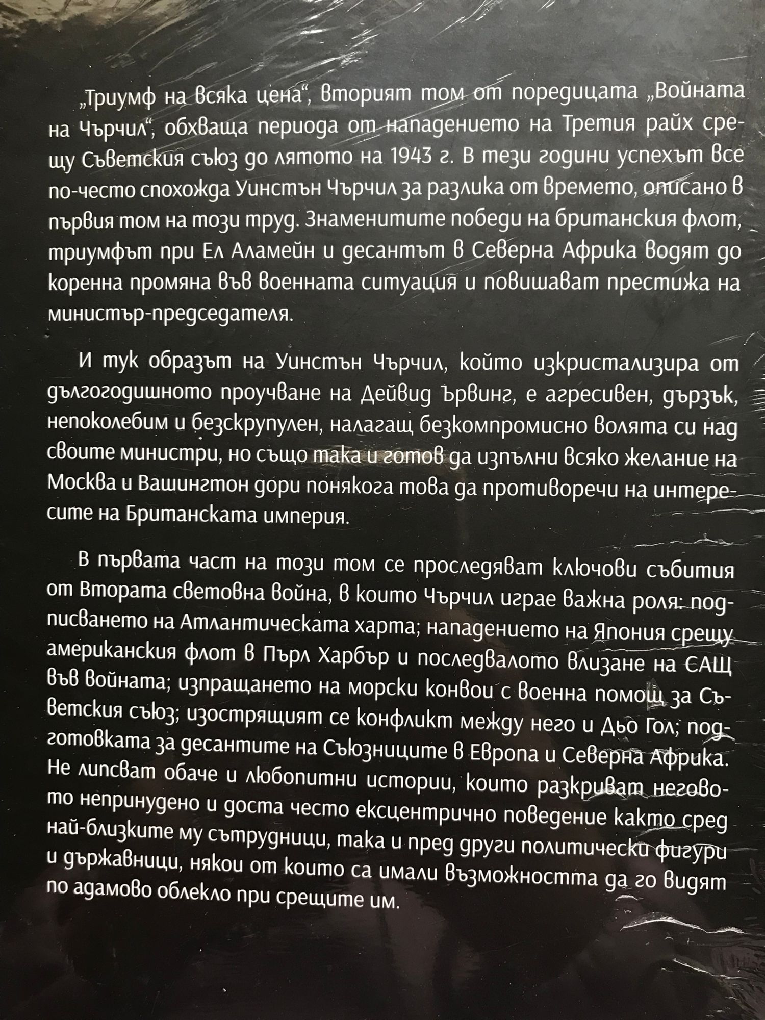 „Триумф на всяка цена“, вторият том от поредицата „Войната на Чърчил“, обхваща периода от нападението на Третия райх срещу Съветския съюз до лятото на 1943 г. В тези години успехът все по-често спохожда Уинстън Чърчил за разлика от времето, описано в първия том на този труд. Знаменитите победи на британския флот, триумфът при Ел Аламейн и десантът в Северна Африка водят до коренна промяна във военната ситуация и повишават престижа на министър-председателя. И тук образът на Уинстън Чърчил, който изкристализира от дългогодишното проучване на Дейвид Ървинг, е агресивен, дързък, непоколебим и безскрупулен, налагащ безкомпромисно волята си над своите министри, но също така и готов да изпълни всяко желание на Москва и Вашингтон дори понякога това да противоречи на интересите на Британската империя. В първата част на този том се проследяват ключови събития от Втората световна война, в които Чърчил играе важна роля: подписването на Атлантическата харта; нападението на Япония срещу американския флот в Пърл Харбър и последвалото влизане на САЩ във войната; изпращането на морски конвои с военна помощ за Съветския съюз; изострящият се конфликт между него и Дьо Гол; подготовката за десантите на Съюзниците в Европа и Северна Африка. Не липсват обаче и любопитни истории, които разкриват неговото непринудено и доста често ексцентрично поведение както сред най-близките му сътрудници, така и пред други политически фигури и държавници, някои от които са имали възможността да го видят по адамово облекло при срещите им.