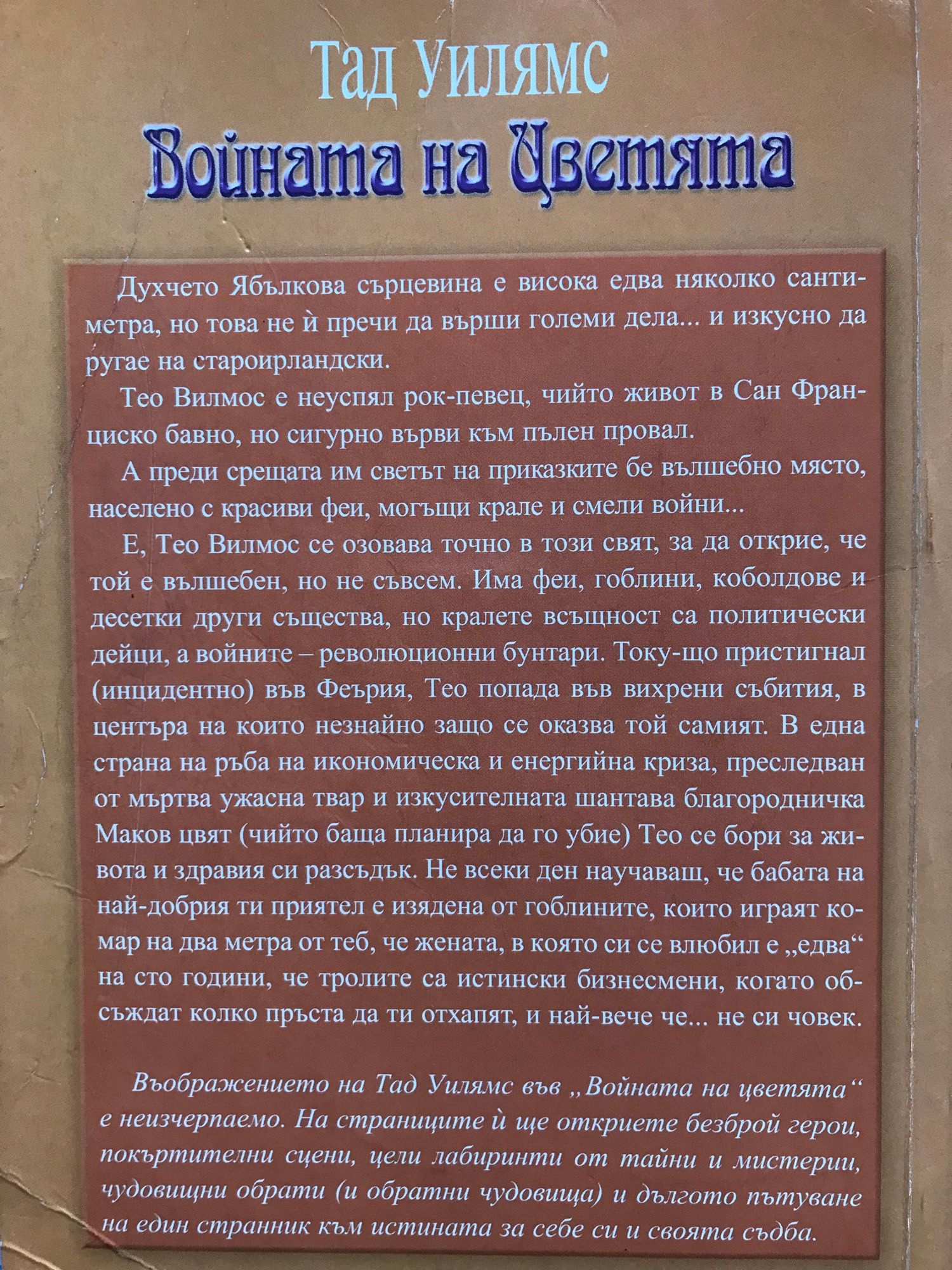 Духчето Ябълкова сърцевина е висока едва няколко сантиметра, но това не й пречи да върши големи дела... и изкусно да ругае на староирландски. Тео Вилмос е неуспял рок-певец, чийто живот в Сан Франциско бавно, но сигурно върви към пълен провал. А преди срещата им светът на приказките бе вълшебно място, населено с красиви феи, могъщи крале и смели войни... Е, Тео Вилмос се озовава точно в този свят, за да открие, че той е вълшебен, но не съвсем. Има феи, гоблини, коболдове и десетки други същества, но кралете всъщност са политически дейци, а войните - революционни бунтари. Току-що пристигнал (инцидентно) във Феърия, Тео попада във вихрени събития, в центъра на които незнайно защо се оказва той самият. В една страна на ръба на икономическа и енергийна криза, преследван от мъртва ужасна твар и изкусителната шантава благородничка Маков цвят (чийто баща планира да го убие) Тео се бори за живота и здравия си разсъдък. Не всеки ден научаваш, че бабата на най-добрия ти приятел е изядена от гоблините, които играят комар на два метра от теб, че жената, в която си се влюбил е "едва" на сто години, че тролите са истински бизнесмени, когато обсъждат колко пръста да ти отхапят, и най-вече че... не си човек. Въображението на Тад Уилямс във "Войната на цветята" е неизчерпаемо. На страниците й ще откриете безброй герои, покъртителни сцени, цели лабиринти от тайни и мистерии, чудовищни обрати (и обратни чудовища) и дългото пътуване на един странник към истината за себе си и своята съдба.