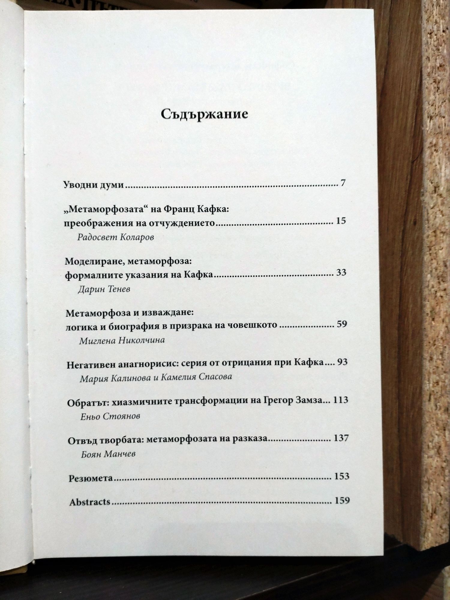 Софийският литературоведски семинар - Радосвет Коларов, Дарин Тенев, Миглена Николчина Камелия Спасова, Мария Калинова, Еньо Стоянов и Боян Манчев - посвети близо две години на внимателно четене на "Метаморфозата". През призмата на тази история в статиите, включени в този сборник, авторите се опитват да предложат собствената си перспектива към разнородни тенденции в съвременните философски и литературоведски дебати. Централно за подходите им е понятието "метаморфоза" и възможността то да се мисли като конструктивно за функцията и фикционалните светове. По-общият залог на колективното усилие е въпросът за статута на литературната теория днес.