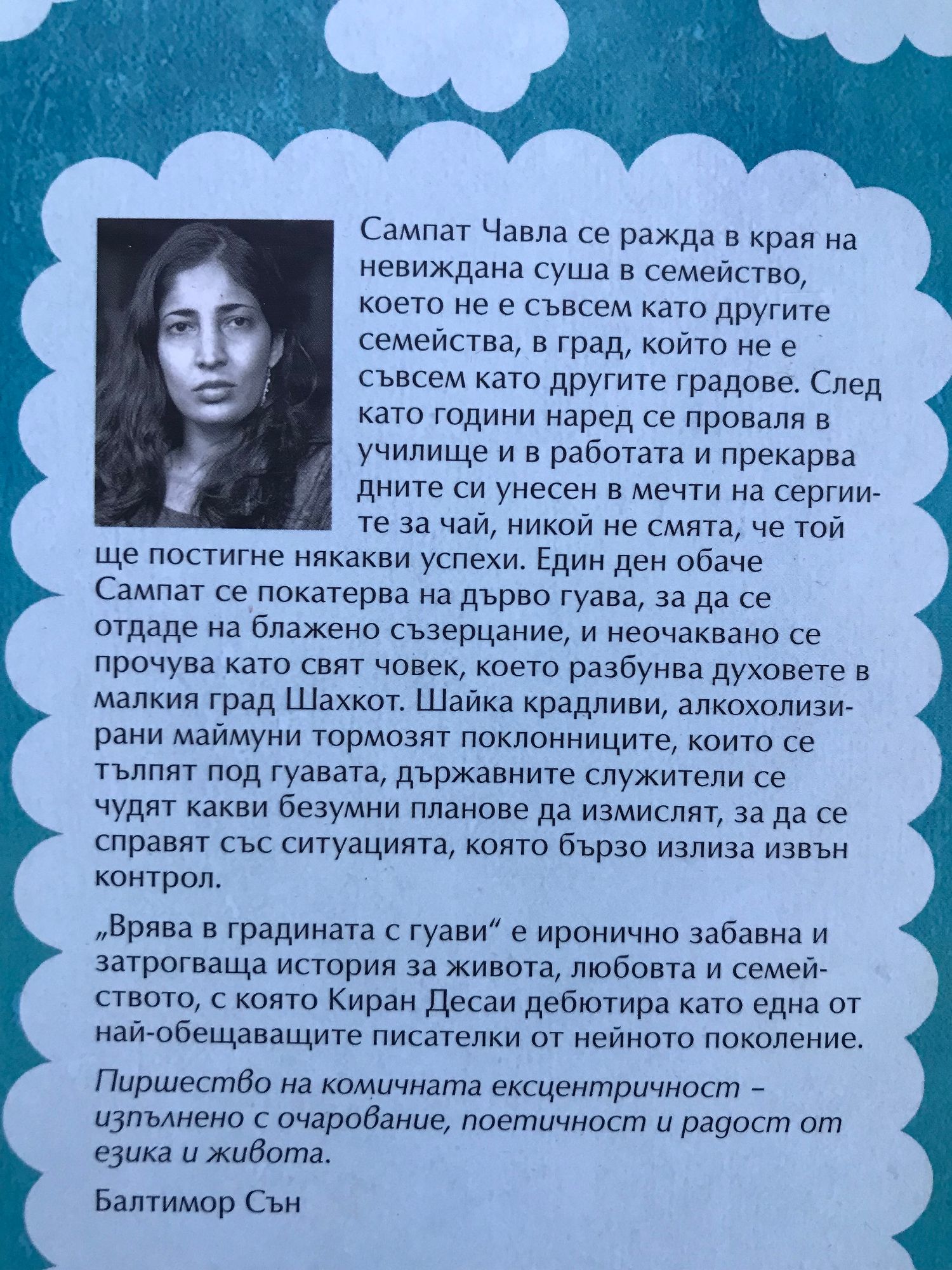 Сампат Чавла се ражда в края на невиждана суша в семейство, което не е съвсем като другите семейства, в град, който не е съвсем като другите градове. След като години наред се проваля в училище и в работата и прекарва дните си унесен в мечти на сергиите за чай, никой не смята, че той ще постигне някакви успехи. Един ден обаче Сампат се покатерва на дърво гуава, за да се отдаде на блажено съзерцание, и неочаквано се прочува като свят човек, което разбунва духовете в малкия град Шахкот. Шайка крадливи, алкохолизирани маймуни тормозят поклонниците, които се тълпят под гуавата, държавните служители се чудят какви безумни планове да измислят, за да се справят със ситуацията, която бързо излиза извън контрол. „Врява в градината с гуави“ е иронично забавна и затрогваща история за живота, любовта и семейството, с която Киран Десаи дебютира като една от най-обещаващите писателки от нейното поколение.