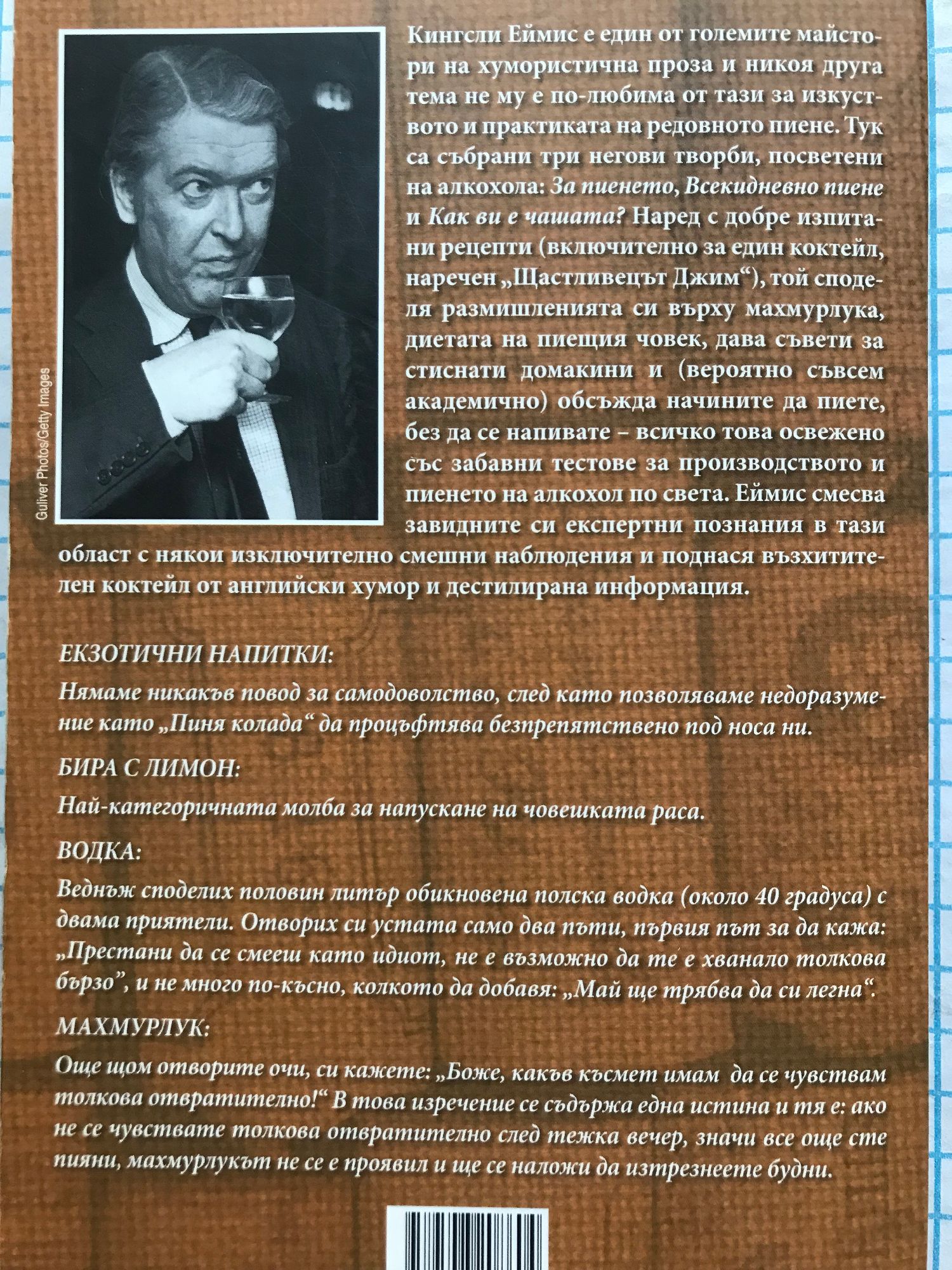 Кингсли Еймис е един от големите майстори на хумористична проза и никоя друга тема не му е по-любима от тази за изкуството и практиката на редовното пиене. Тук са събрани три негови творби, посветени на алкохола: За пиенето, Всекидневно пиене и Как ви е чашата? Наред с добре изпитани рецепти (включително за един коктейл, наречен «Щастливецът Джим»), той споделя размишленията си върху махмурлука, диетата на пиещия човек, дава съвети за стиснати домакини и (вероятно съвсем академично) обсъжда начините да пиете, без да се напивате – всичко това освежено със забавни тестове за производството и пиенето на алкохол по света. Еймис смесва завидните си експертни познания в тази област с някои изключително смешни наблюдения и поднася възхитителен коктейл от английски хумор и дестилирана информация. ЕКЗОТИЧНИ НАПИТКИ: Нямаме никакъв повод за самодоволство, след като позволяваме недоразумение като «Пиня колада» да процъфтява безпрепятствено под носа ни. БИРА С ЛИМОН: Най-категоричната молба за напускане на човешката раса. ВОДКА: Веднъж споделих половин литър обикновена полска водка (около 70 градуса) с двама приятели. Отворих си устата само два пъти, първия път за да кажа: «Престани да се смееш като идиот, не е възможно да те е хванало толкова бързо!», и не много по-късно, колкото да заявя: «Май ще трябва да си легна». МАХМУРЛУК: Още щом отворите очи, си кажете: «Боже, какъв късмет имам да се чувствам толкова отвратително!» В това изречение се съдържа една истина и тя е: ако не се чувствате толкова отвратително след тежка вечер, значи все още сте пияни, махмурлукът не се е проявил и ще се наложи да изтрезнеете будни.