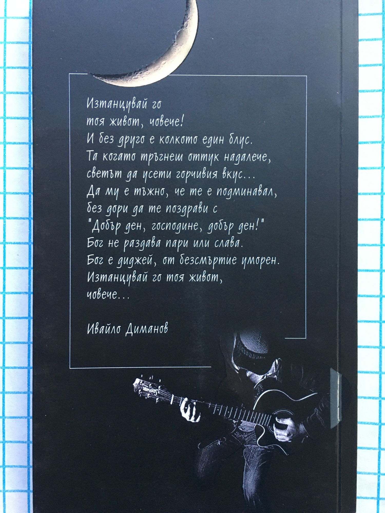 Заглавието на книгата казва почти всичко за поета Ивайло Диманов. Най-малкият и симпатичен столичен площад „Гарибалди“ е синоним и на неговия дом, и на работата му в клуба на СБЖ в съседство. „Най-после! Авторска антология с избрана поезия. Благодаря ти, Господи, че сбъдна моята мечта…“ – възкликва поетът в социалните мрежи .