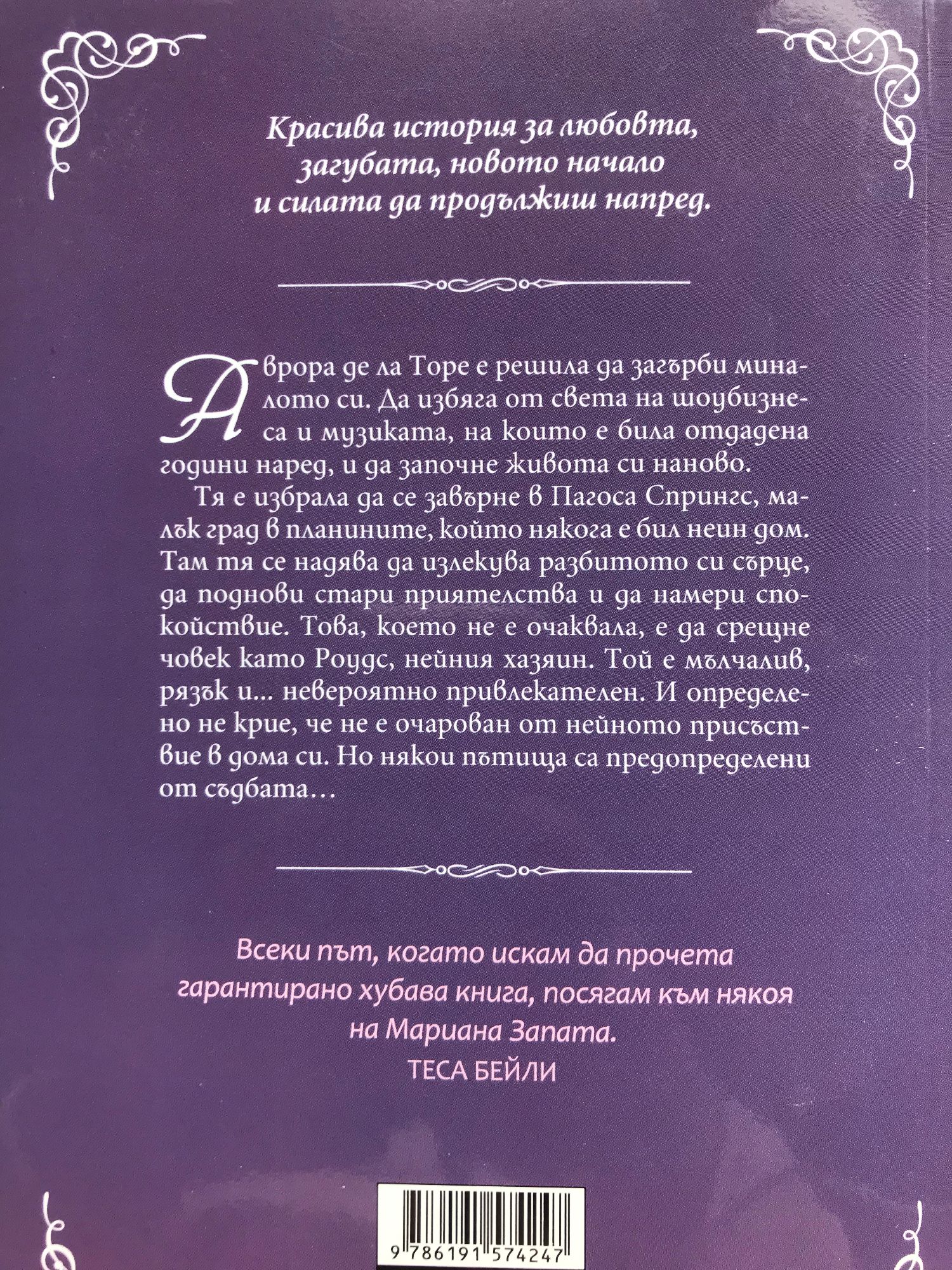 Красива история за любовта, загубата, новото начало и силата да продължиш напред. Aврора де ла Торе е решила да загърби миналото си. Да избяга от света на шоубизнеса и музиката, на които е била отдадена години наред, и да започне живота си наново. Тя е избрала да се завърне в Пагоса Спрингс, малък град в планините, който някога е бил неин дом. Там тя се надява да излекува разбитото си сърце, да поднови стари приятелства и да намери спокойствие. Това, което не е очаквала, е да срещне човек като Роудс, нейния хазяин. Той е мълчалив, рязък и... невероятно привлекателен. И определено не крие, че не е очарован от нейното присъствие в дома си. Но някои пътища са предопределени от съдбата… „Всяка книга на Мариана Запата е чисто злато... Истински дар за почитателите на романтиката!“ АЛИ ХЕЙЗЪЛУУД „Всеки път, когато искам да прочета гарантирано хубава книга, посягам към някоя на Мариана Запата.“ ТЕСА БЕЙЛИ