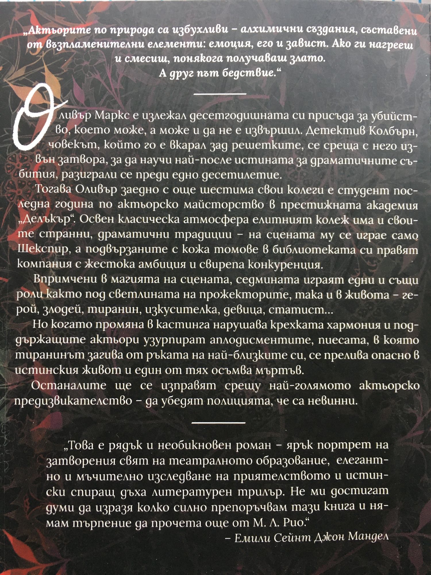 „Актьорите по природа са избухливи – алхимични създания, съставени от възпламенителни елементи: емоция, его и завист. Ако ги нагрееш и смесиш, понякога получаваш злато. А друг път бедствие.” Оливър Маркс е излежал десетгодишната си присъда за убийство, което може, а може и да не е извършил. Детектив Колбърн, човекът, който го е вкарал зад решетките, се среща с него извън затвора, за да научи най-после истината за драматичните събития, разиграли се преди едно десетилетие. Тогава Оливър заедно с още шестима свои колеги е студент последна година по актьорско майсторство в престижната академия „Делъкър“. Освен класическа атмосфера елитният колеж има и своите странни, драматични традиции – на сцената му се играе само Шекспир, а подвързаните с кожа томове в библиотеката си правят компания с жестока амбиция и свирепа конкуренция. Впримчени в магията на сцената, седмината играят едни и същи роли както под светлината на прожекторите, така и в живота – герой, злодей, тиранин, изкусителка, девица, статист… Но когато промяна в кастинга нарушава крехката хармония и поддържащите актьори узурпират аплодисментите, пиесата, в която тиранинът загива от ръката на най-близките си, прелива опасно близо в истинския живот и един от тях осъмва мъртъв. Останалите ще се изправят срещу най-голямото актьорско предизвикателство – да убедят полицията, че са невинни.