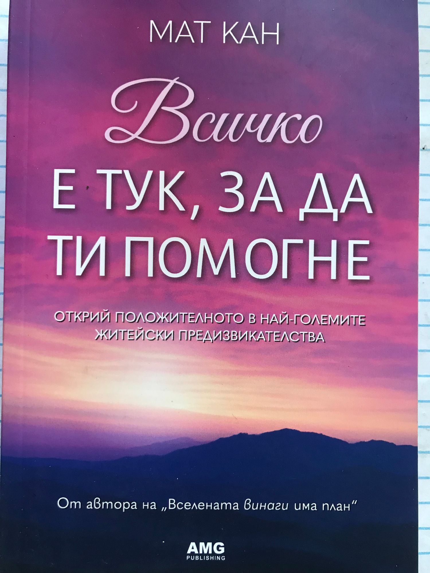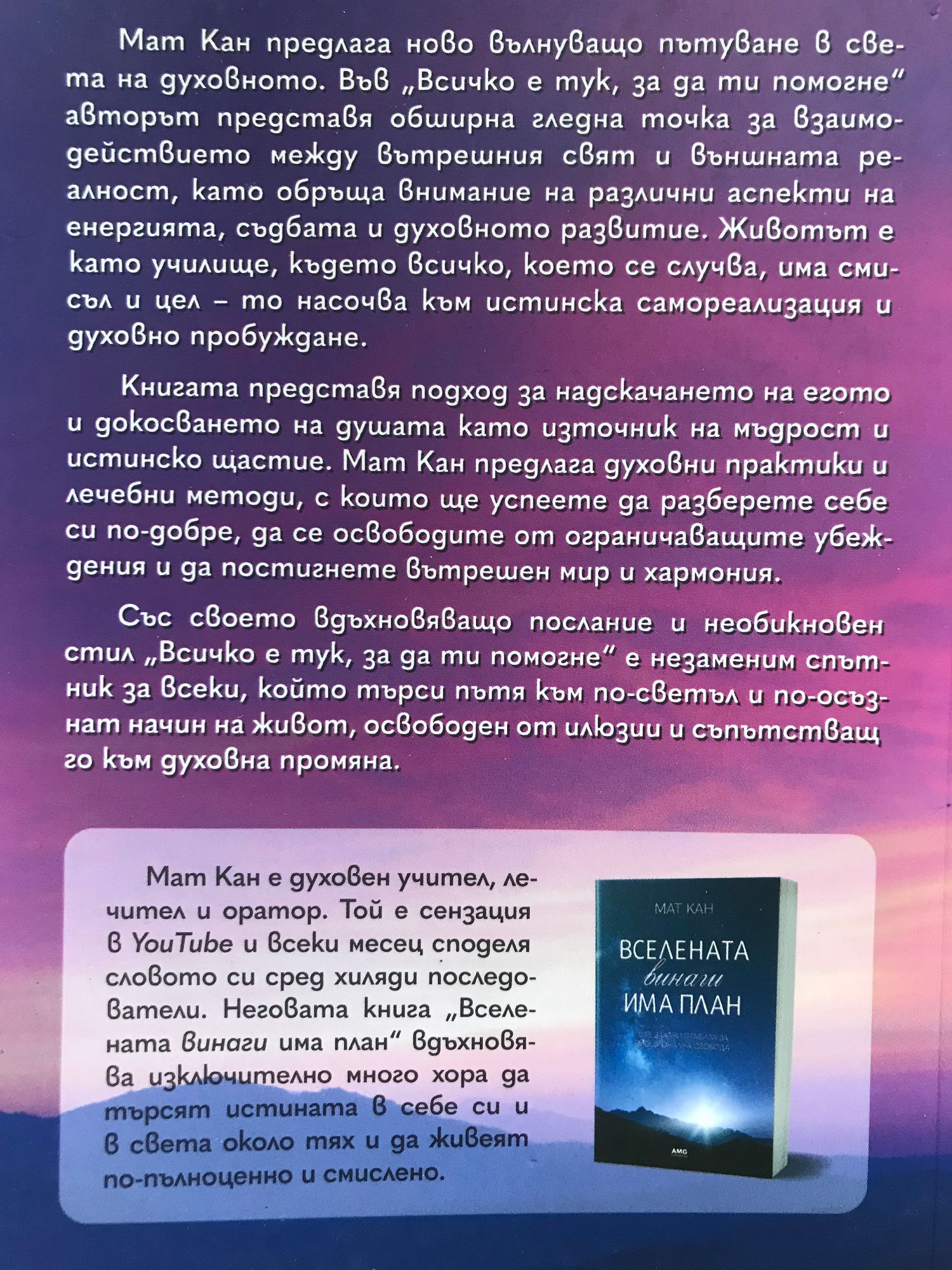 Мат Кан предлага ново вълнуващо пътуване в света на духовното. Във „Всичко е тук, за да ти помогне“ авторът представя обширна гледна точка за взаимодействието между вътрешния свят и външната реалност, като обръща внимание на различни аспекти на енергията, съдбата и духовното развитие. Животът е като училище, където всичко, което се случва, има смисъл и цел – то насочва към истинска самореализация и духовно пробуждане. Книгата представя подход за надскачането на егото и докосването на душата като източник на мъдрост и истинско щастие. Мат Кан предлага духовни практики и лечебни методи, с които ще успеете да разберете себе си по-добре, да се освободите от ограничаващите убеждения и да постигнете вътрешен мир и хармония. Със своето вдъхновяващо послание и необикновен стил „Всичко е тук, за да ти помогне“ е незаменим спътник за всеки, който търси пътя към по-светъл и по-осъзнат начин на живот, освободен от илюзии и съпътстващ го към духовна промяна.