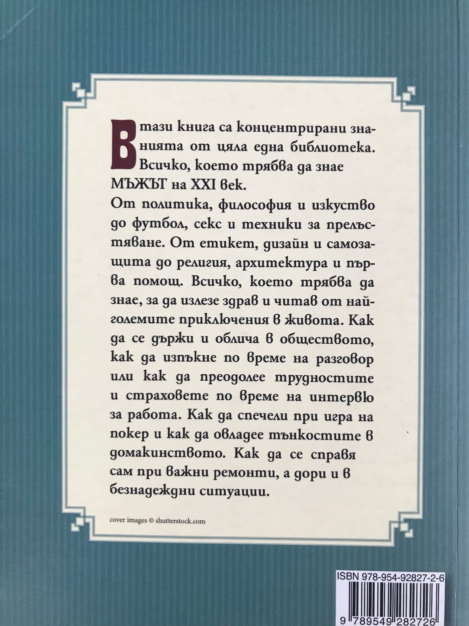 В тази книга са концентрирани знанията от цяла една библиотека. Всичко, което трябва да знае МЪЖЪТ на XXI век. От политика, философия и изкуство до футбол, секс, техники за прелъстяване. От етикет, дизайн и самозащита до религия, архитектура и първа помощ. Всичко, което трябва да знае, за да излезе здрав и читав от най-големите приключения в живота. Как да се държи и облича в обществото, как да изпъкне по време на разговор или да преодолее трудностите и страховете по време на интервю за работа. Как да спечели при игра на покер и как да овладее тънкостите в домакинството. Как да се справя сам при важни ремонти, а дори и в безнадеждни ситуации.