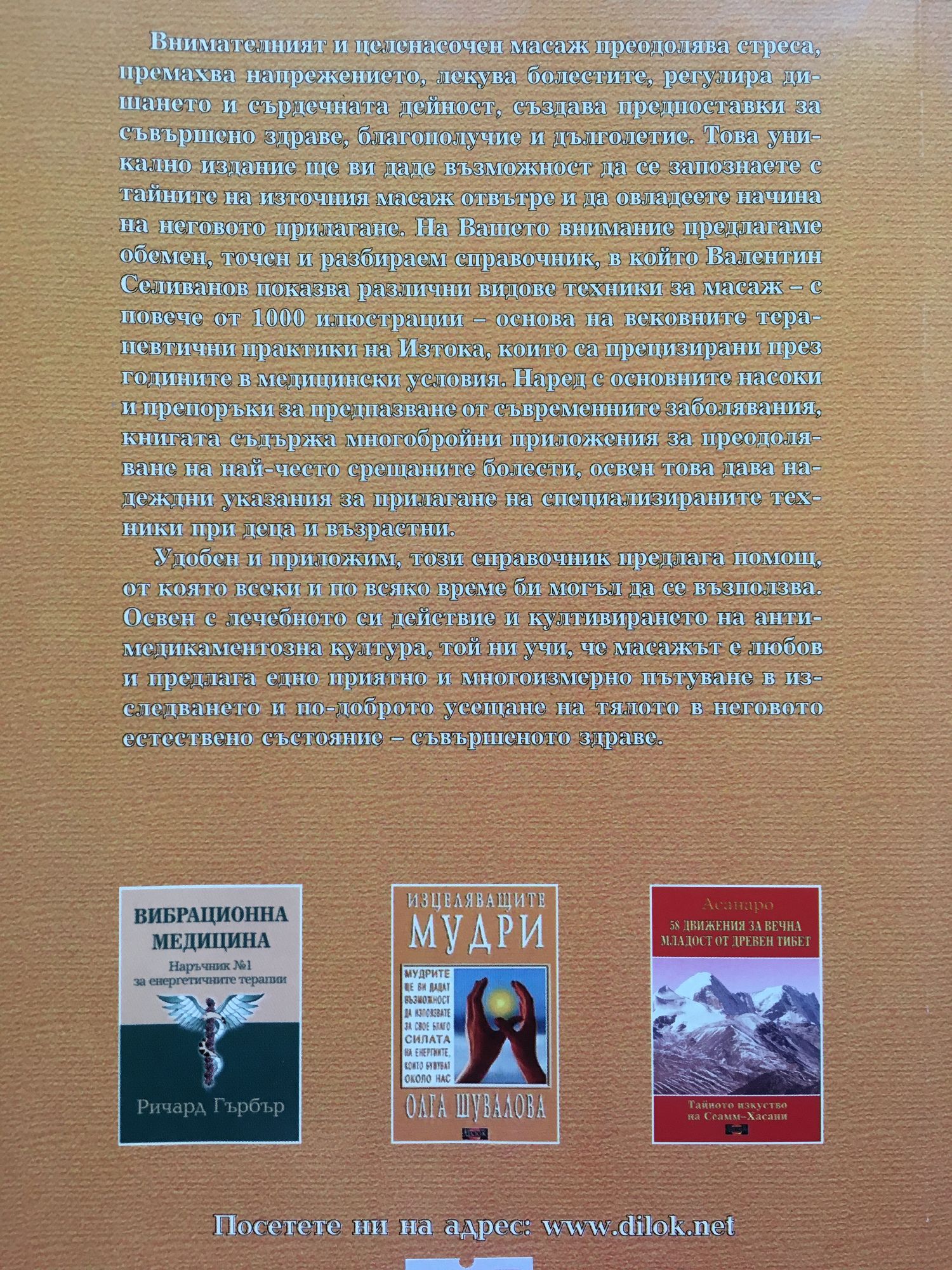 Когато говорим за един или друг метод на лечение, е прието като най-важно да се изтъква неговата надеждност и доколко е проверен в практиката. Има много книги, в които се цитират безсмъртните трудове на Хипократ или Авицена, с което авторите се стремят да направят възможно най-силно впечатление. И постигат целта си. Не влагам в това никаква ирония, тъй като описаните от тези известни личности начини за лечение са достойни за уважение и до ден днешен не са изгубили своята актуалност. Няма необходимост от подобни позовавания на авторитетите, за да представим масажа като един от лечебните методи, защото разтриването на болното място е естествен, рефлекторен акт. А какво може да бъде по-добро, по-полезно и надеждно от вродения отговор на организма срещу всяко болезнено въздействие. Всъщност, за да изработи лечебна методика въз основа на естествената реакция на организма, от човека не се е изисквало кой знае колко - да обобщи натрупания опит, да измисли съответната терминология и да въведе класификация. Всичко останало зависи от ръцете на лечителя, от неговия опит, от дарбата му да поставя диагнози и така нататък. Терминът "масаж" е от арабски произход, което означава "докосване" и е дошъл до нас през френското "massage". Масажът се разделя на спортен и лечебен. Тази класификация е твърде условна, тъй като и в двата случая се използват едни и същи похвати. Ключовата разлика се състои в това, че при спортния масаж манипулациите се изпълняват в посока от проксималните области към дисталните (например от бедрото към стъпалото, от рамото към китката), а при лечебния е обратно. Самите манипулации - разтриване, омачкване, поглаждане и потупване — в тази книга са описани съвсем подробно. Въпреки че прилагането на масажните методики изисква определена подготовка, по-специално познаване на терминологията и някои натурфилософски концепции, с помощта на приложените рисунки читателят лесно ще се справи с поставената задача. Тъй като за различни категории болни (деца, бременни, възрастни) редица от обсъжданите точкови зони и методите за въздействие върху тях съвпадат, част от материала в отделни глави и раздели се припокрива. Но, както казват хората, повторението е майка на знанието. И още няколко практически съвета. Следвайки традицията е прието всички методи първоначално да изпитвате върху себе си. Масажът трябва да се прилага редовно. Както и в други области от народната медицина, и тук е от значение убедеността на пациента, че масажа ще му помогне, така както помага на милиони хора по целия свят. В Китай се смята, че масажа ще даде на силния дълъг живот, а на слабия - възможност да преодолее недъзите и да възстанови здравето си. И така, чака ви среща с увлекателна, полезна и не съвсем обичайна книга, която си поставя благородната цел да ви помогне да укрепите вашето здраве. С уважение: ВАЛЕНТИН СТАНИСЛАВОВИЧ СЕЛИВАНОВ