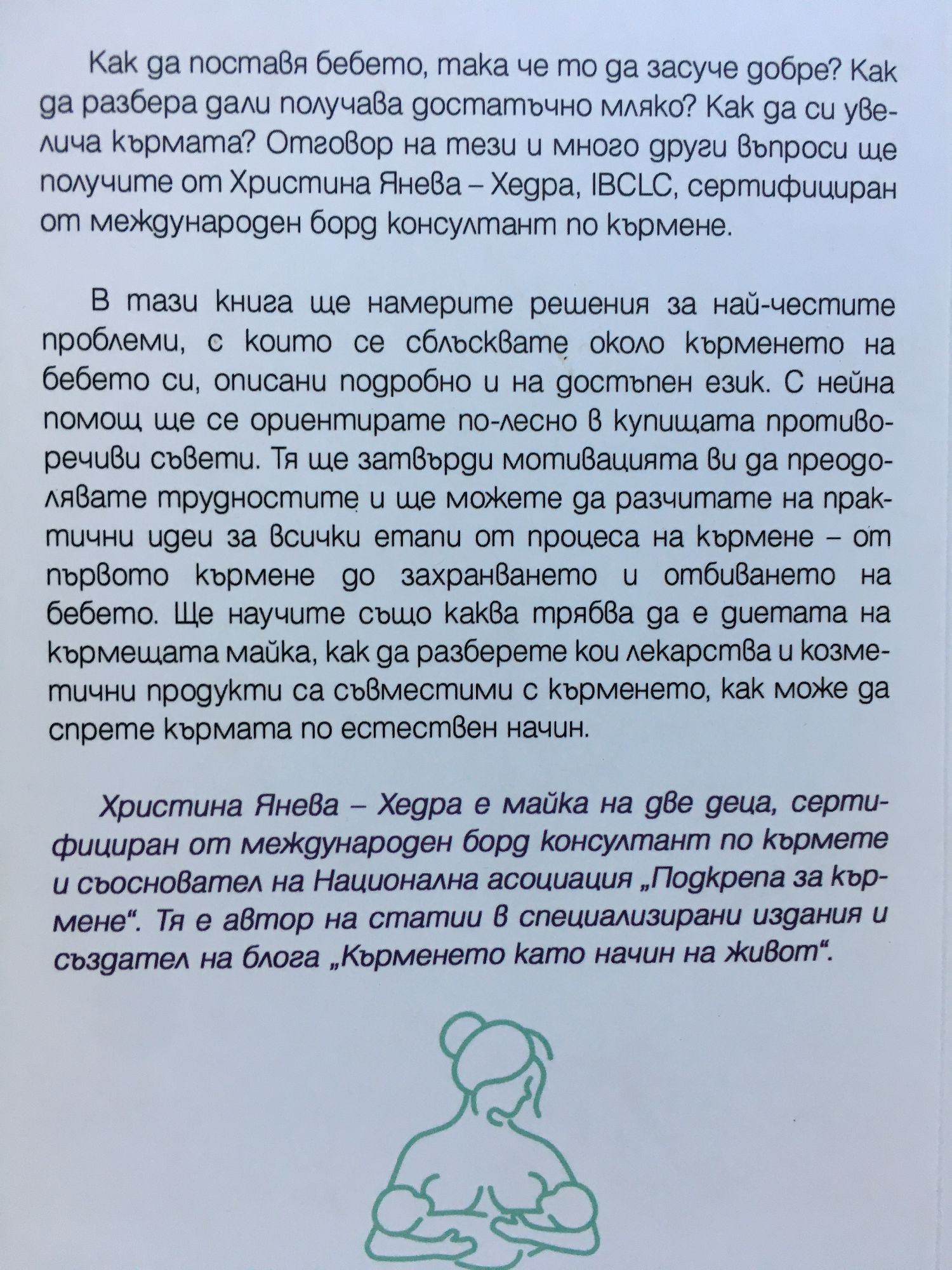 Как да поставя бебето, така че то да засуче добре? Как да разбера дали получава достатъчно мляко? Как да си увелича кърмата?. В тази книга ще намерите решения за най-честите проблеми, с които се сблъсквате около кърменето на бебето си, описани подробно и на достъпен език. С нейна помощ ще се ориентирате по-лесно в купищата противоречиви съвети, ще затвърди мотивацията ви да преодолявате трудностите и ще можете да разчитате на практични идеи за всички етапи от процеса на кърмене – от първото кърмене до захранването и отбиването на бебето. Ще научите също каква трябва да е диетата на кърмещата майка, как да разберете кои лекарства и козметични продукти са съвместими с кърменето, как може да спрете кърмата по естествен начин. Христина Янева – Хедра е майка на две деца, сертифициран от международен борд консултант по кърмете и съосновател на Национална асоциация „Подкрепа за кърмене”. Тя е автор на статии в специализирани издания и създател на блога „Кърменето като начин на живо"